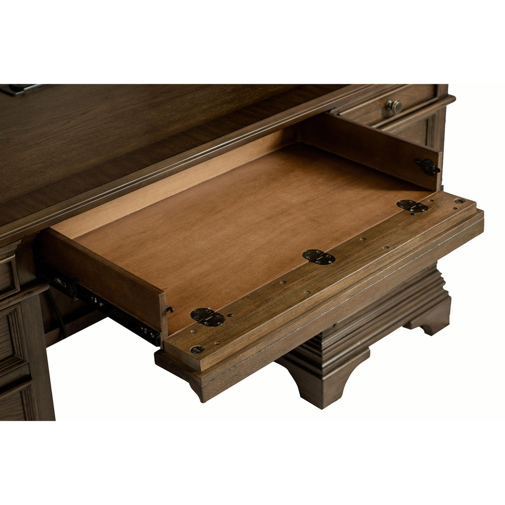 • Credenza includes a power outlet (2AC/2USB), center keyboard drawer, two top drawers and middle drawer with removable dividers, one lockable file cabinet, and a cabinet with an adjustable shelf