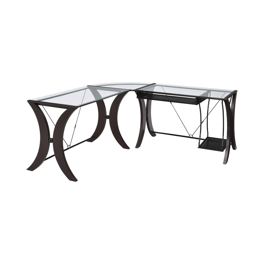 This contemporary, three-piece computer desk is an effortless blend of glamour and functionality. Its base is composed of gracefully curved metal lines for a smooth, sleek silhouette. Finished in gorgeous shades of cappuccino and glossy black, it boasts a truly elegant look. A clear tempered glass top adds a pleasing touch of shine. This desk features a built-in CPU stand and keyboard drawer for your convenience.