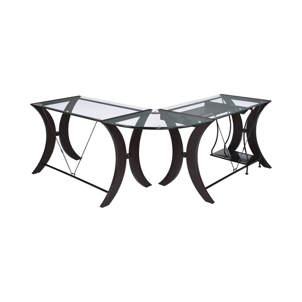 • Style and luxury meet in contemporary L-shape three-piece computer desk with cappuccino finish