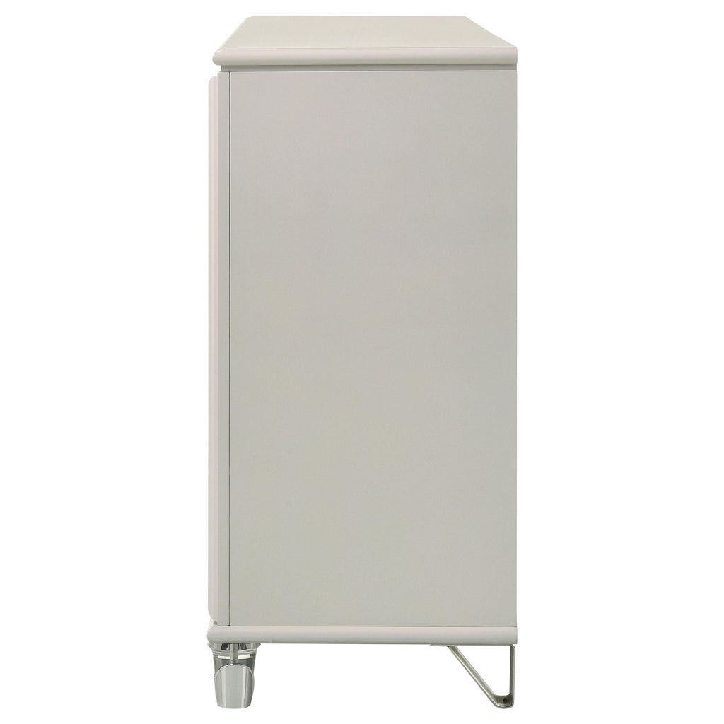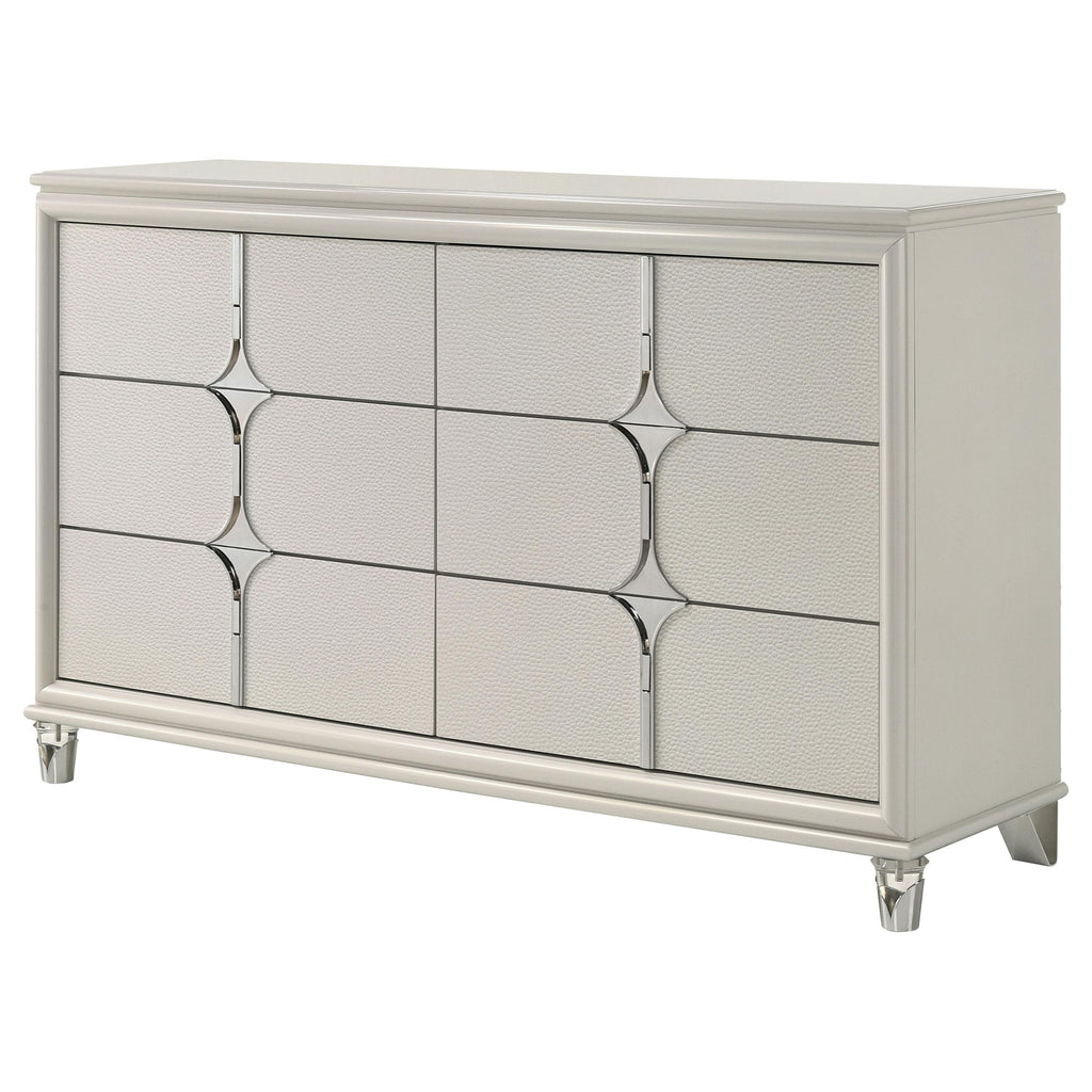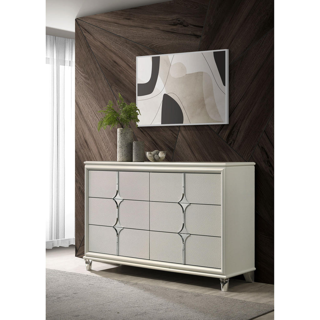 Enhance your bedroom’s allure with this exquisite 6-drawer dresser, a masterpiece of modern design and practical elegance. The pearl white finish, complemented by mirror framing and unique diamond star drawer fronts, exudes sophistication. Special features like the removable jewelry tray in a secret drawer and polished chrome accents elevate this dresser to a class of its own. With ample storage and finger tab chrome metal pulls, this piece combines functionality with style. Make a statement in your bedroom with this captivating dresser.