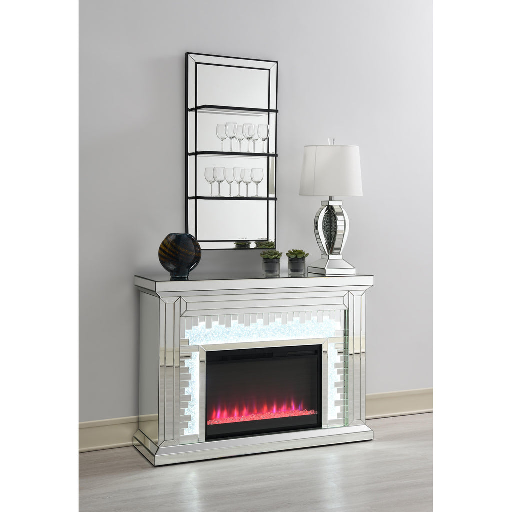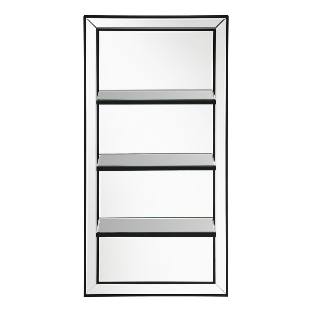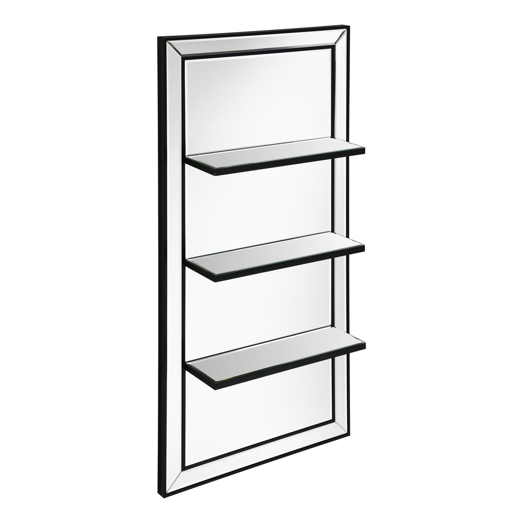 Present decor, bedroom essentials, and more along this modern glam wall mirror. Designed with an elongated, vertical mounting silhouette, this elegant wall mirror offers three narrow shelves to keep anything from perfumes to family photos. Covered entirely in a mirror tile, this wall mirror offers a dark tone edge that offers a defined contrast against the reflective mirror surfaces. A slim beveled edge along the outer mirror frame creates a classical aesthetic and hint of texture. Mount this wall mirror in a compact space to give the illusion of a more spacious interior.