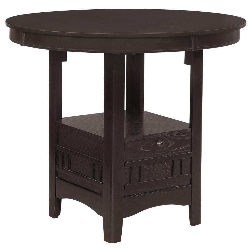 From the Lavon Collection is this modern counter height table. Table top extends 18" when the leaf is folded up for an intimate gathering of close friends. Closed storage unit on based makes impromptu gatherings a breeze to entertain. Top shelf on base holds cups or glasses for whatever the occasion. Matching espresso finish counter height chairs upholstered in black leatherette are sold separately. x