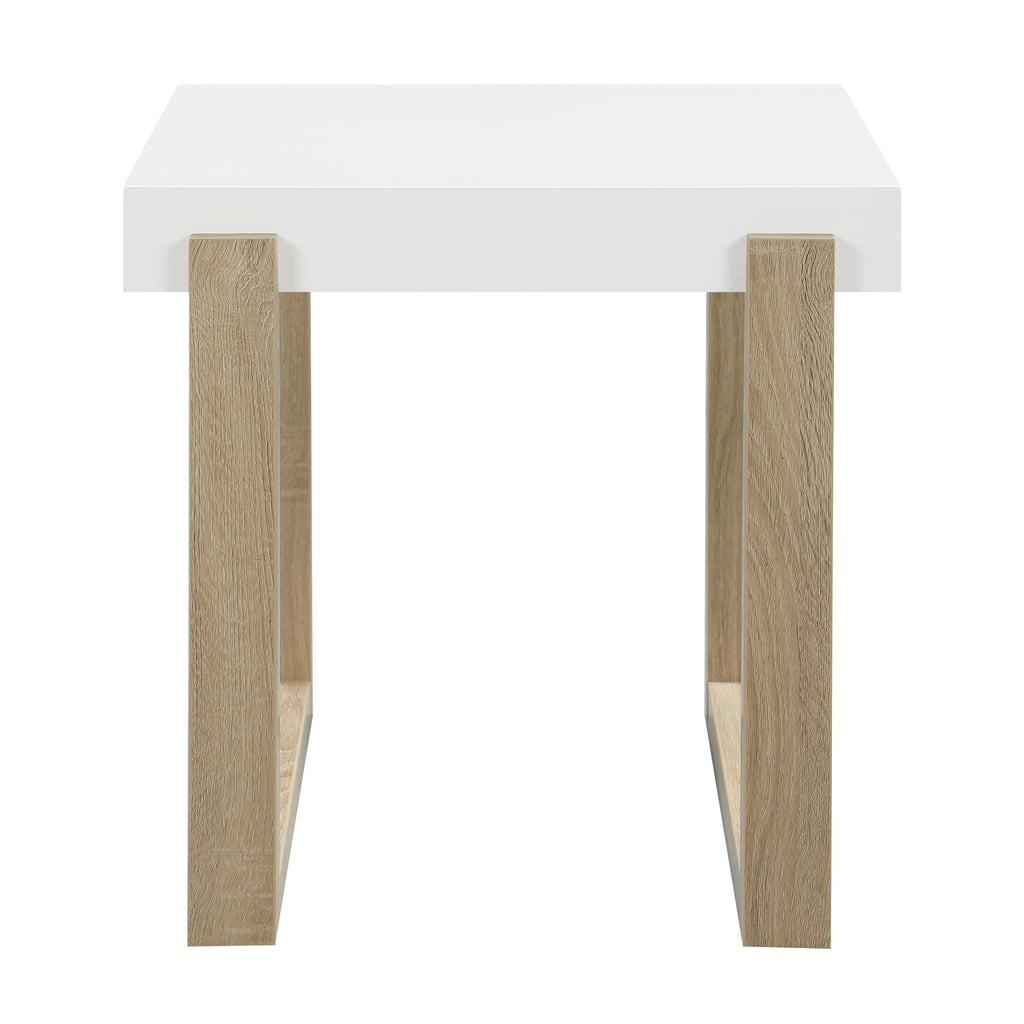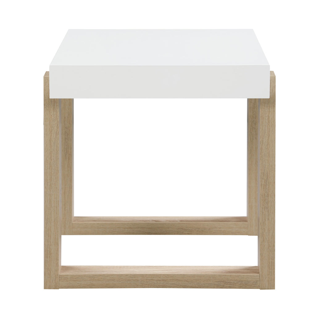 This modern end table combines a whimsical design with cheerfully bright hues. Its thick, square white high-gloss tabletop adds a minimalist aesthetic while resting on a double U-shaped base in a light natural finish. The base showcases subtle wood grain patterns, providing a charming contrast. Perfect for compact spaces, this side table serves as a functional accent piece, whether next to a sofa or an accent chair, supporting lamps, decor, or daily essentials.