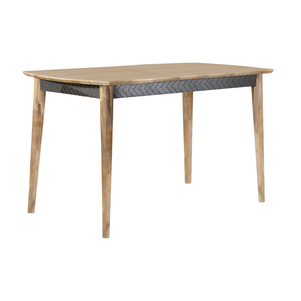 A perfect addition to contemporary homes, this Partridge 5-piece counter height dining set adds warmth to a dining area with its solid natural Sheesha wood frame. Along the apron of the table is an arrow-inspired graphical design in a contrasting black hue. An industrial-inspired counter height stool is wrapped in leather upholstery across the contoured backrest and seat offering ultimate comfort and stability. This set includes a counter height dining table, 2 camel counter height stools, and 2 black counter height stools.