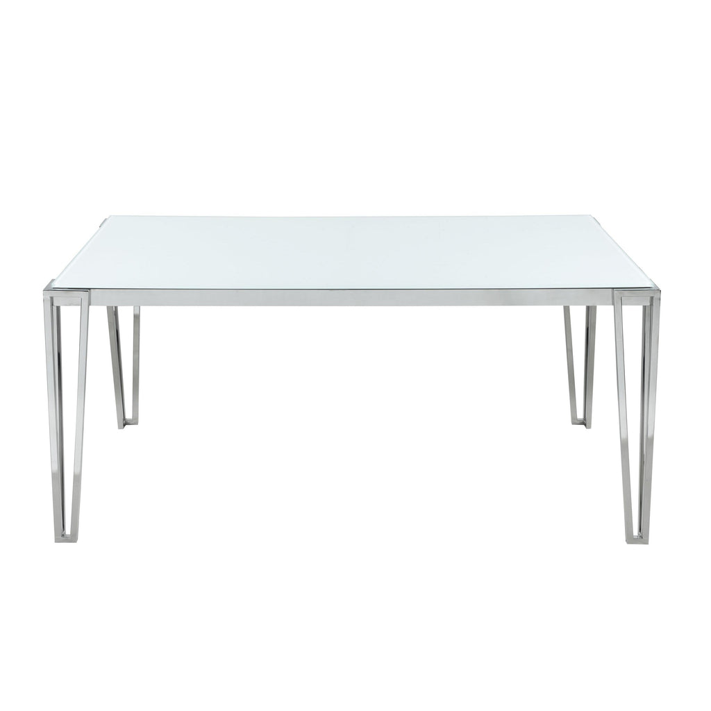Perfect for contemporary dining rooms, this rectangle dining table offers seating for up to six guests. Designed with clean lines and a minimal silhouette, this table can be used a more casual modern piece or elevated into a formal dining table. Built of sturdy stainless steel metal with a polished chrome finish, it's easy to maintain and made to last for many years in the home. Each hairpin-inspired leg is made modern with slim corner brackets. Rested on top of a white frosted tempered glass tabletop surface that can complement your home's already existing colors.