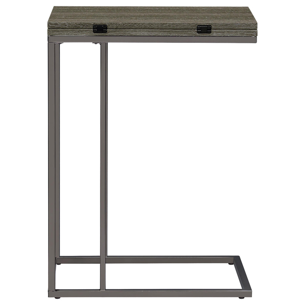 This versatile C-table combines functionality and sleek design, perfect for modern living spaces. Crafted with an engineered wood top featuring a scratch-resistant laminate veneer, it offers durability and style. The top folds out, providing expanded surface area when needed. Supported by a sturdy metal base with an electroplated finish, it blends practicality with elegance. Its slim profile allows it to slide easily under sofas or chairs, making it an ideal space-saving solution.