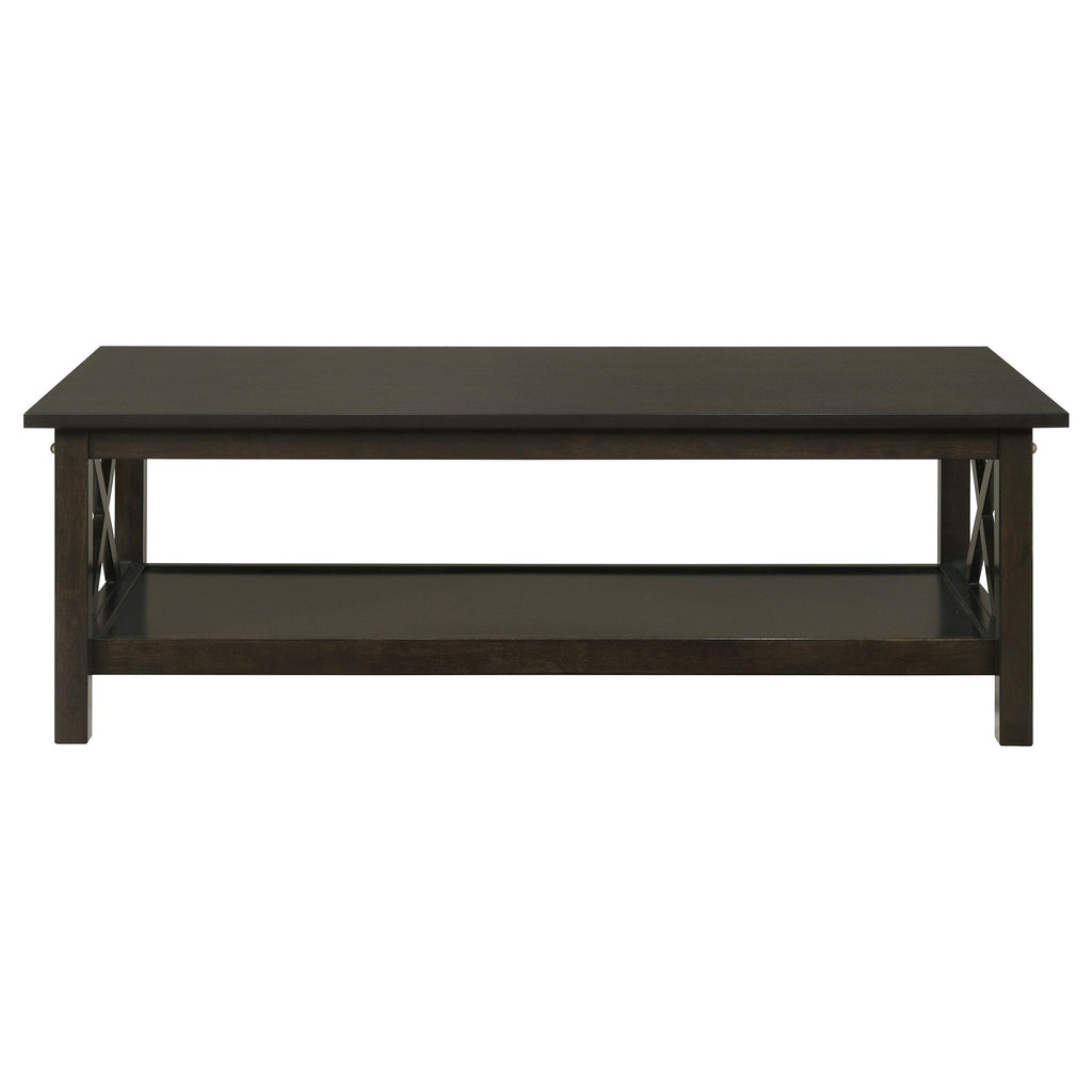 This 3-piece occasional table set includes a coffee table and two end tables, ideal for a living room or lounge. Constructed from hardwood, engineered wood, and rubberwood veneer, this set showcases a rich dark merlot finish. Each piece is designed with a lower shelf for extra storage space, while the X-shaped accents on the sides add a touch of visual appeal. This coffee table set is a perfect combination of form and function for your home.
