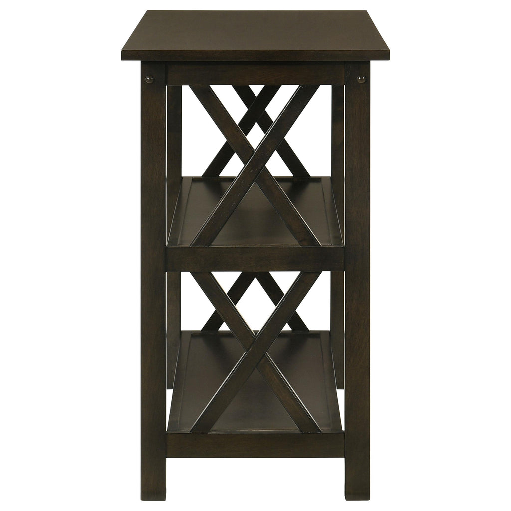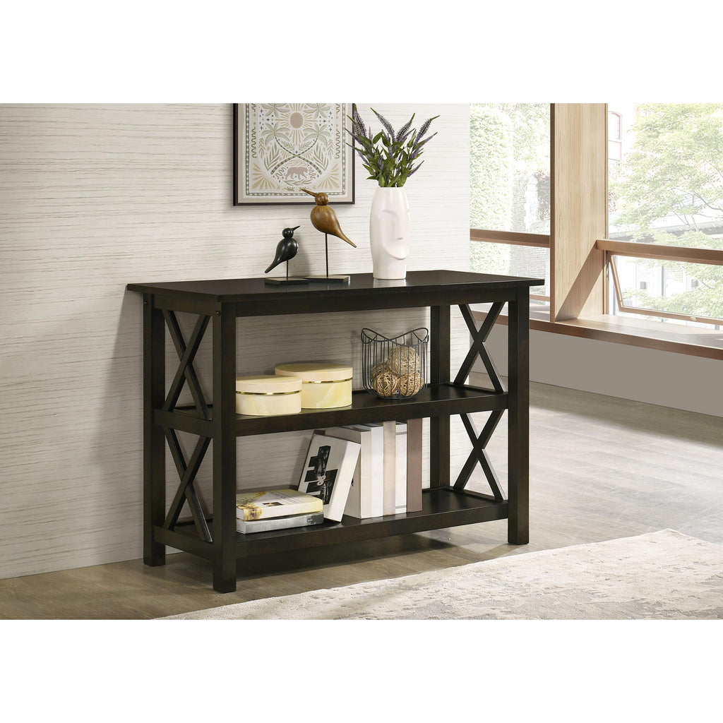 Bring an energizing look to a transitional space. With linear styling and geometric x-shapes on its side panels, this console table creates an eye-catching effect. Deep merlot offers a scrumptious, dramatic finish that blends well with surrounding furnishings. Find plenty of shelf space to match its rectangular surface. Place behind a sofa or against a wall for a central focus.
