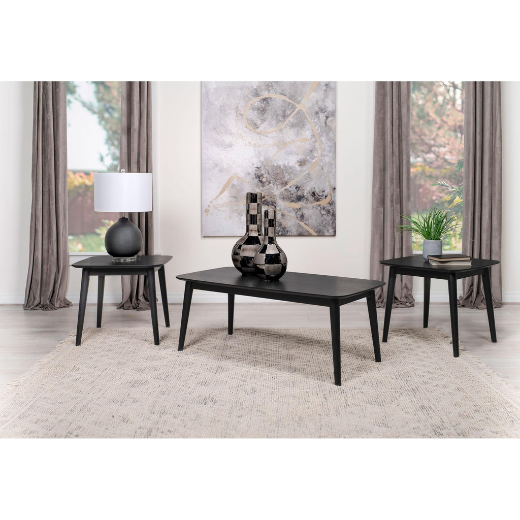 Amid the modern milieu, a three-piece coffee occasional table set stands as a beacon of mid-century inspiration. The coffee table, along with its twin end tables, boasts a black finish so deep it seems to hold secrets within its ash veneer wood grain. Elegant angles converge in the 45-degree chamfered edge profile, softening the silhouette while maintaining a crisp, architectural line. This ensemble, crafted from a harmonious blend of solid and engineered wood, is a tribute to both form and function, a striking centerpiece to any gathering space where stories are shared over cups of coffee.