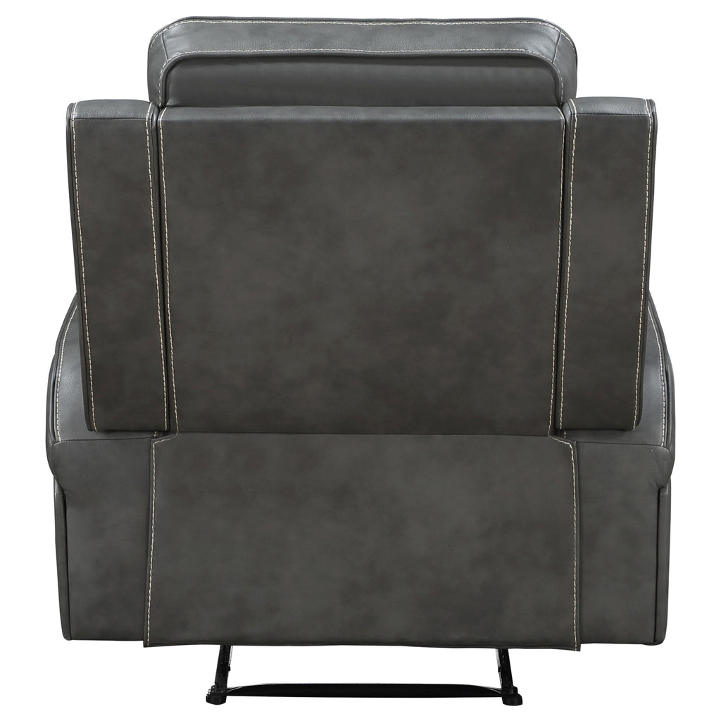 Merging the classic style of both contemporary and transitional design schemes, the recliner creates a dreamy venue for relaxing. The trending look of smooth grey leatherette upholstery with vertical topstitching delivers decorative elements and a dimensional impact. This recliner features foam padding on its frame and a pocket coil spring seat cushion, as an attached back cushion is capped with an ultra-plump headrest. Recline into varying positions using a manual control function, and enjoy space efficiency with its wall-hugger design. This recliner chair offers the perfect blend of stylish updated aesthetics and an ultimately cozy seating venue.
