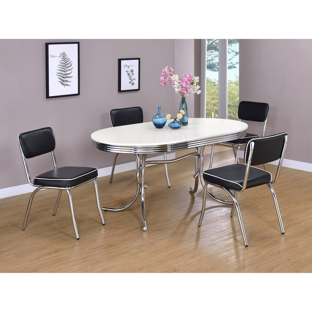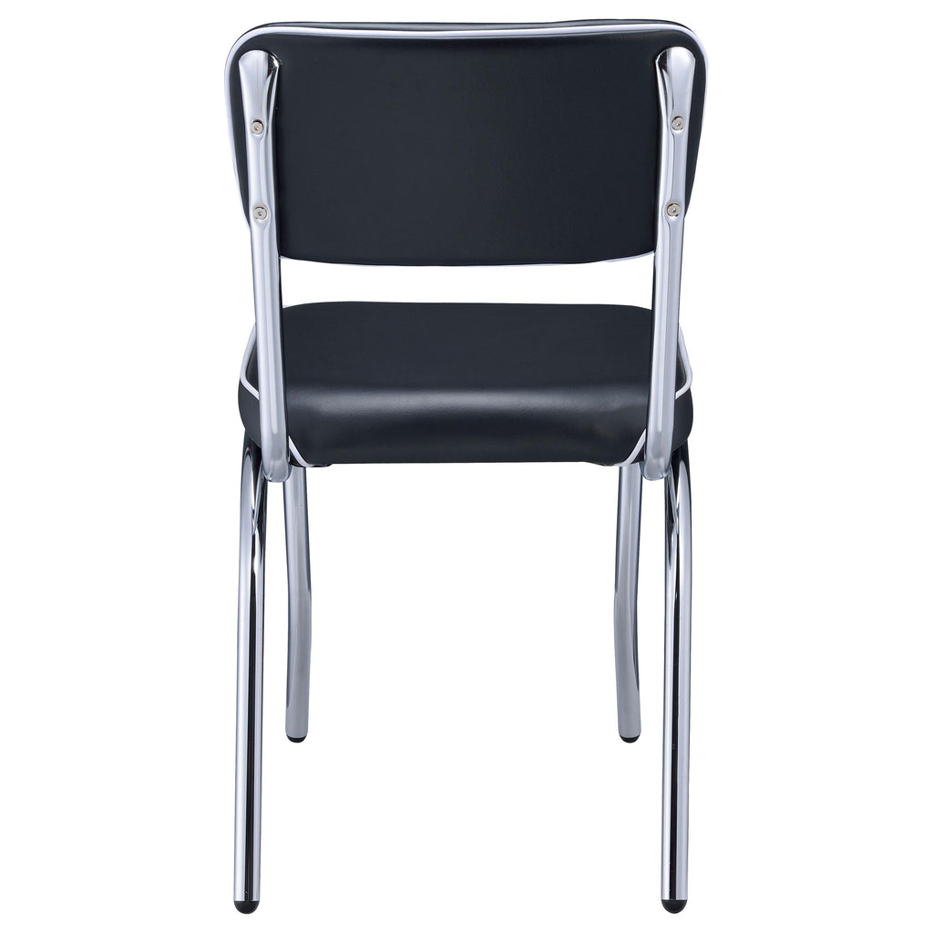 With distinctive styling and classic appeal, this vintage-inspired chair completes your dining ensemble in style. Its rear legs are gracefully curved for sturdy support, while its front legs are more subdued with a subtle, tapered design. With a shining chrome frame, this chair lends vintage inspiration to enhance any dining experience. Its comfy cushion is available in two gorgeous shades. You can choose vibrant red to punch up your decor with a splash of color, or opt for a more subtle black cushion for simple, subdued comfort.
