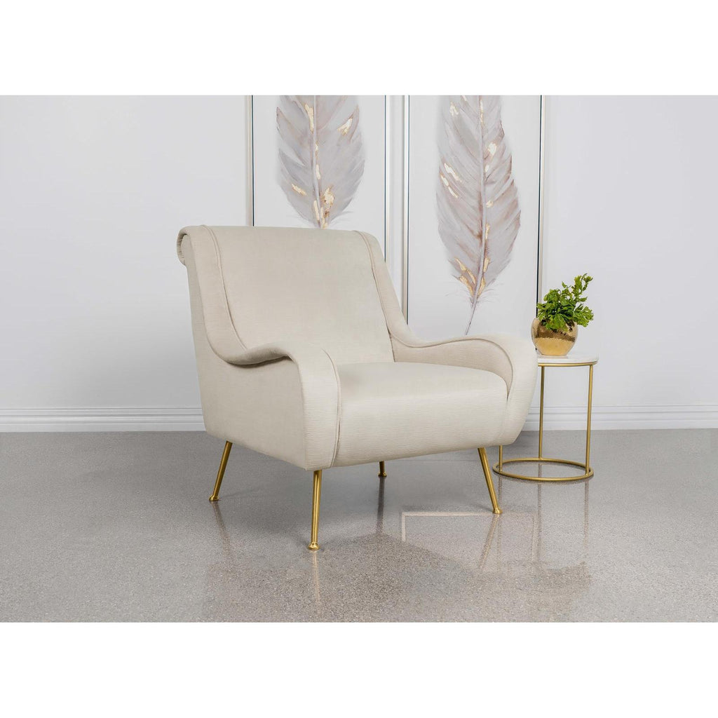 With a stylishly curvy silhouette, this accent chair offers an artisan approach to furnishings in your custom casual or semi-formal space. Embellish a living room or family room with a chic chair creating palette versatility and a romantic ambiance. Relax in style and beauty with a delicious design in seating, starting with plywood framing and soft textured velvet upholstery. Alluring flared silhouetting on its full-length armrests adds comfort in conjunction with an extra-wide build, as a comfy attached seat invites hours of pleasing leisure. Bring in a hint of retro style with slender, splayed gold metal legs and button caps that create a whimsical satellite effect.