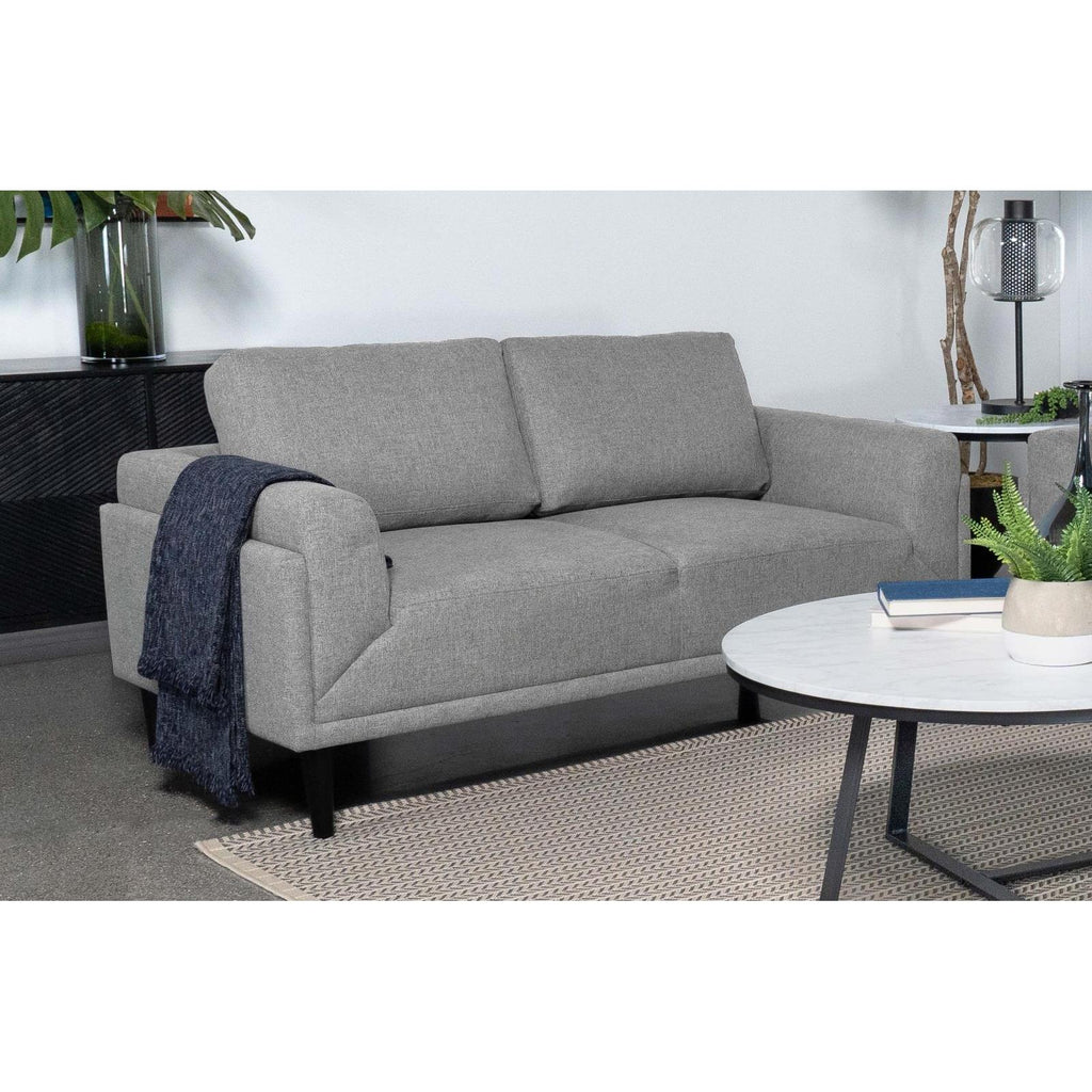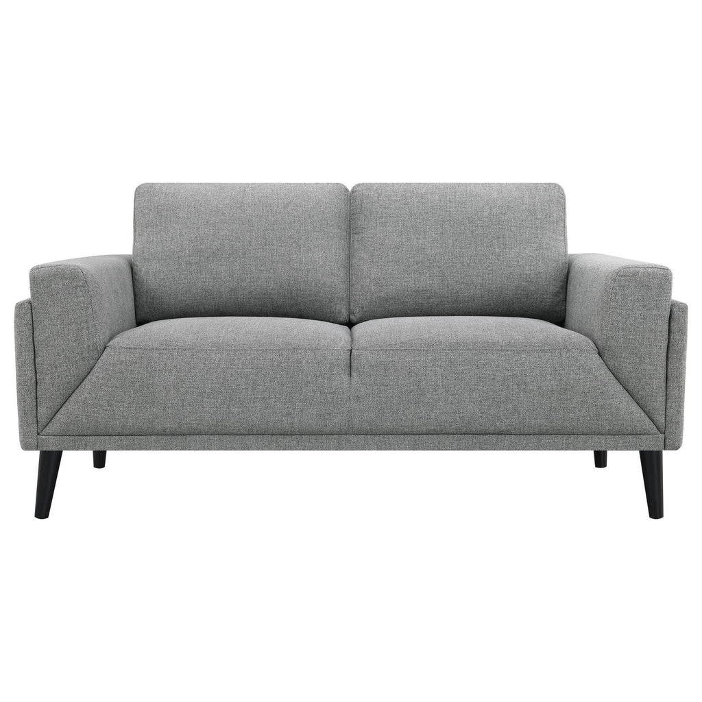 Unveiling our modern loveseat, where innovation meets elegance in a frame within a frame design. Adorned in a chic fabric, its streamlined silhouette is highlighted by meticulous topstitch details and track arms complemented by mitered front accents. Prioritizing comfort, the sofa comes with reversible back cushions and pocket coil seat construction, ensuring a snug and supportive seating experience. Anchored by tall, black cylinder-shaped wooden legs, this sofa stands as a blend of style and function, ready to be the centerpiece in any contemporary living space.