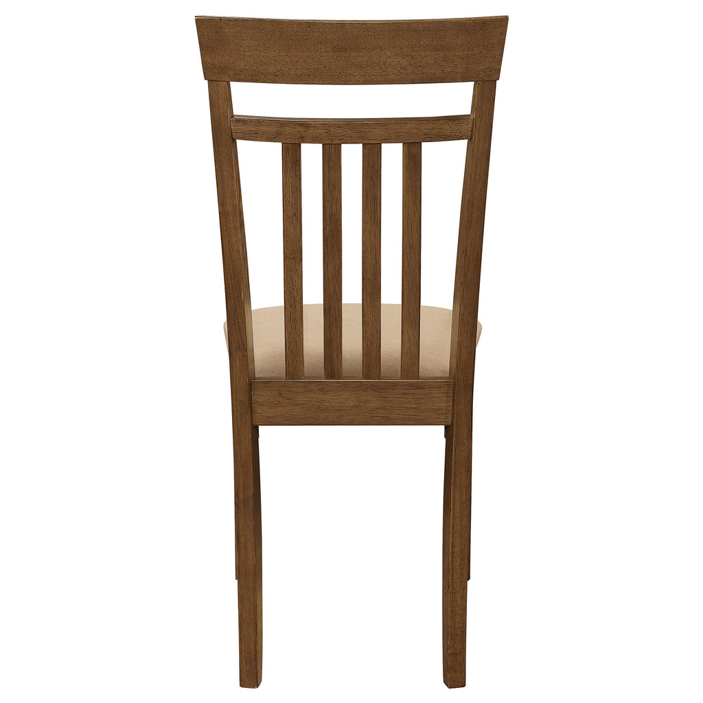 Gather your loved ones round to experience the luxurious comfort and elegant style of this five-piece dining set. This sleek, classically designed set comes complete with one table and four chairs. Clean and subtly curved lines create a minimalistic rectangular dining table. A handsome slatted wood backrest adds flair and dimension to its chairs. Cushy, comfy padded seats are covered in soft, beige fabric that feels exquisite to the touch.