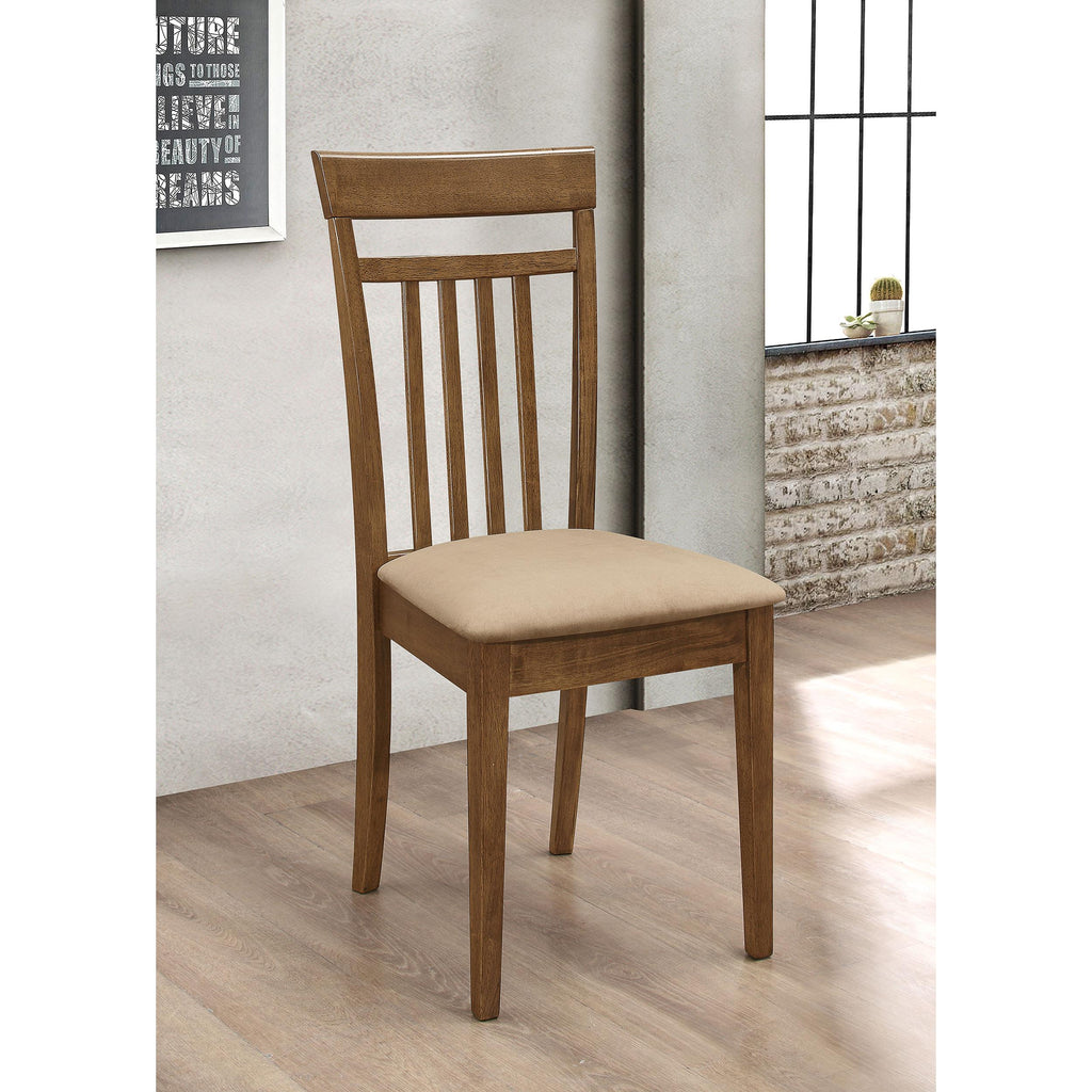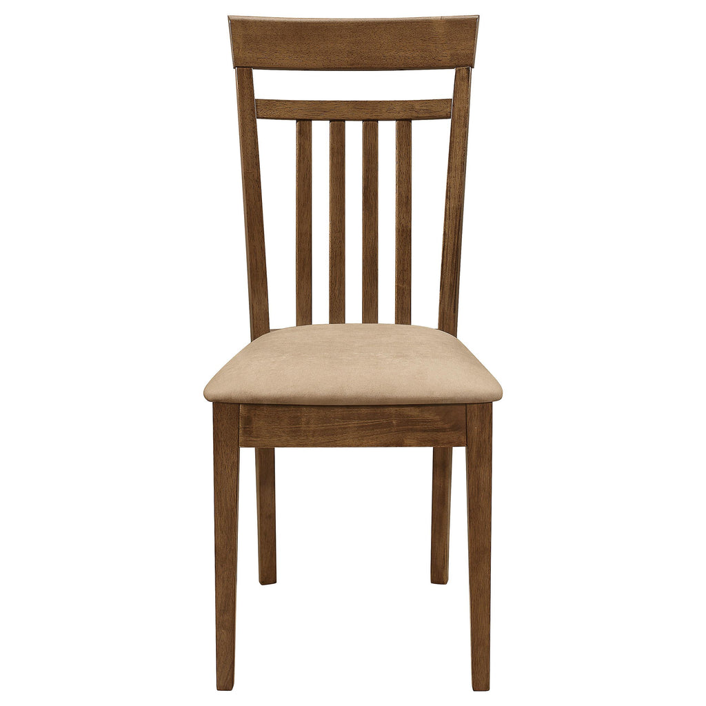 • Mission style chairs feature cushioned seats in soft tan microfiber