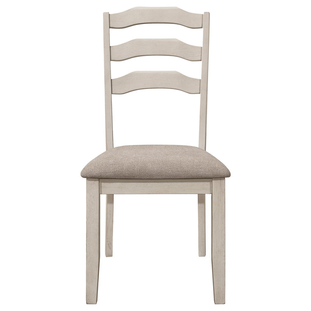 Enhance the cozy atmosphere of your dining space with our modern farmhouse and coastal cottage dining side chairs. These ladder back chairs exude a charming rustic appeal with their distressed cream finish on the legs and back. The khaki polyester fabric upholstered seat ensures optimal comfort during meals.