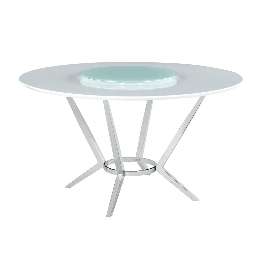 Elegant and ultra-modern, this contemporary dining table is as functional as it is stylish. Built of sturdy metal base, it features a shiny chrome finish on each of its boomerang-shaped legs. The round tabletop offers a high gloss white finish that adds a glamorous touch. In addition, the tabletop can seat up to six guests and family members comfortably. Plus, it offers a highly functional lazy susan, which is also removable for more formal occasions.