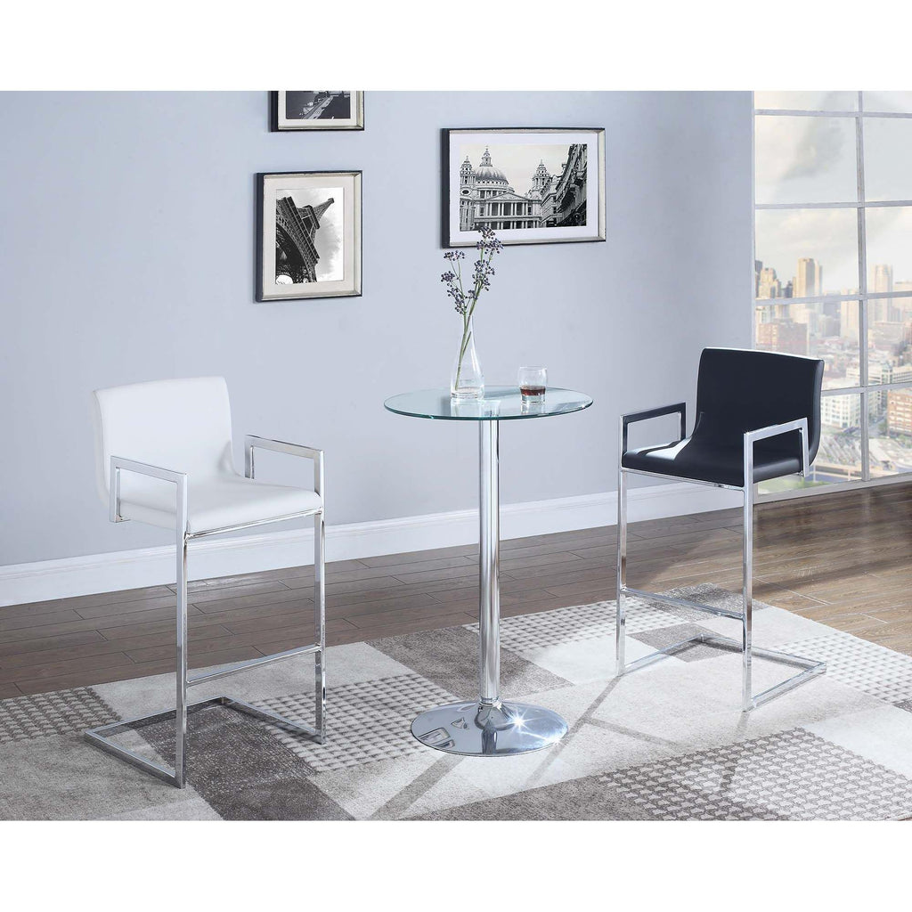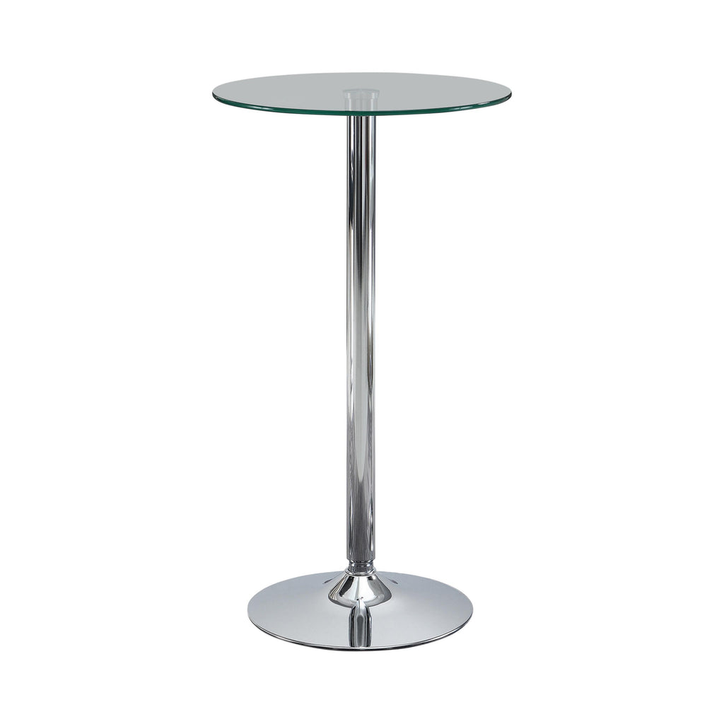 Sleek and modern, this round bar table is a beautiful addition to contemporary decor. Perfect in a small kitchen nook or in a home lounge, the table features a clear tempered glass table top ideal for drinks or appetizers. The glass creates a surface that looks great and is easy to maintain. A pedestal base features a round foot and gleaming chrome finish. Choose and equally elegant pair of barstools (sold separately) for a cool, sophisticated upgrade.