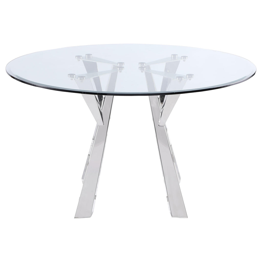 Center your sophisticated dining space on the impeccably designed Alaia round dining table. Instilling a sense of glamorous energy, the table boasts a geometric base design crafted in metal with rich angularity and elegance. Gleaming chrome finish plays up the glam look, perfect for a semi-formal space, whether in a dining room or highlighting your breakfast nook. A glass tabletop is thick and stylish, complete with a 25mm beveled edge that creates a finished look and feel. Complete the look with a vase of fresh-cut flowers or serve up a delectable brunch.