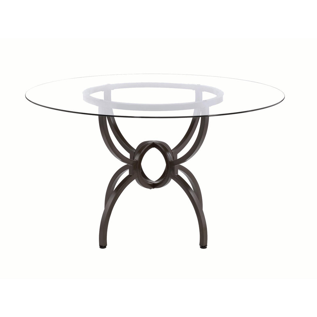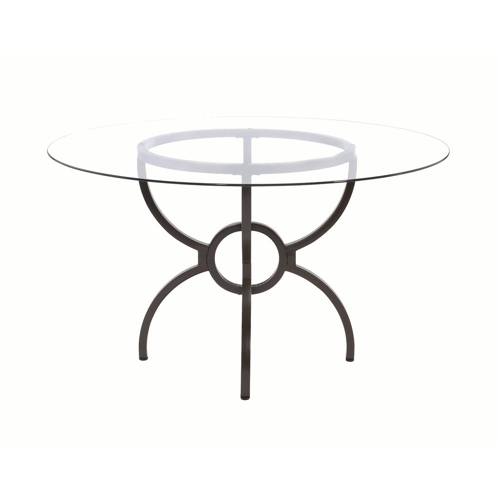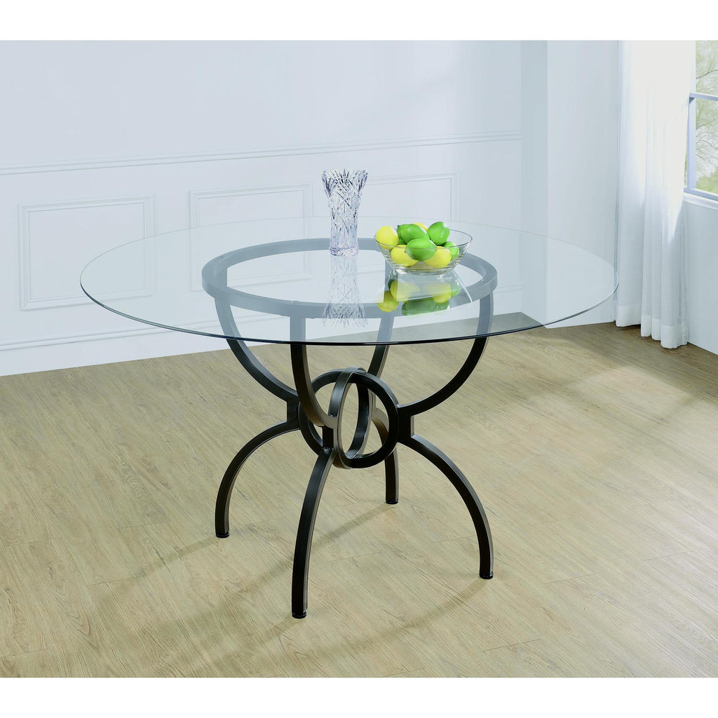 Curves abound on this intriguing transitional glass dining table. Featuring a casual and inviting aura, the table boasts a round of clear glass resting on a bold base. The base shows off metal construction with four stylized M legs that meet in an interlocking ring motif. A gunmetal finish lends a rich final touch. This table is perfect for a stylish breakfast nook or eat-in kitchen.