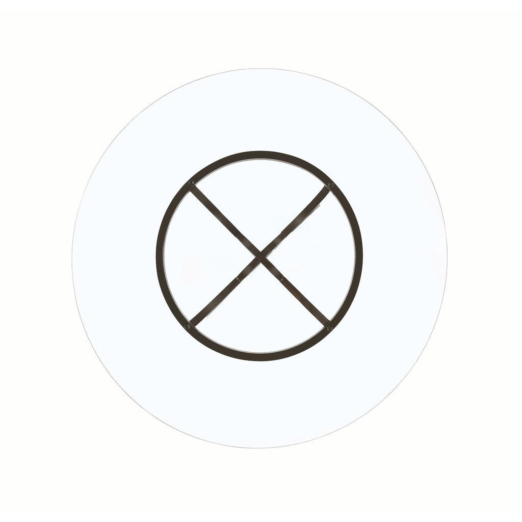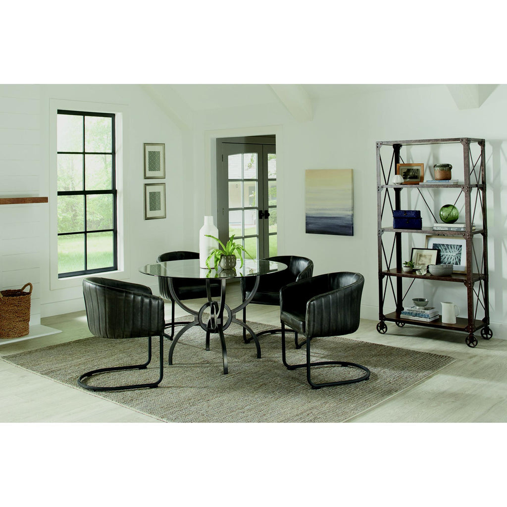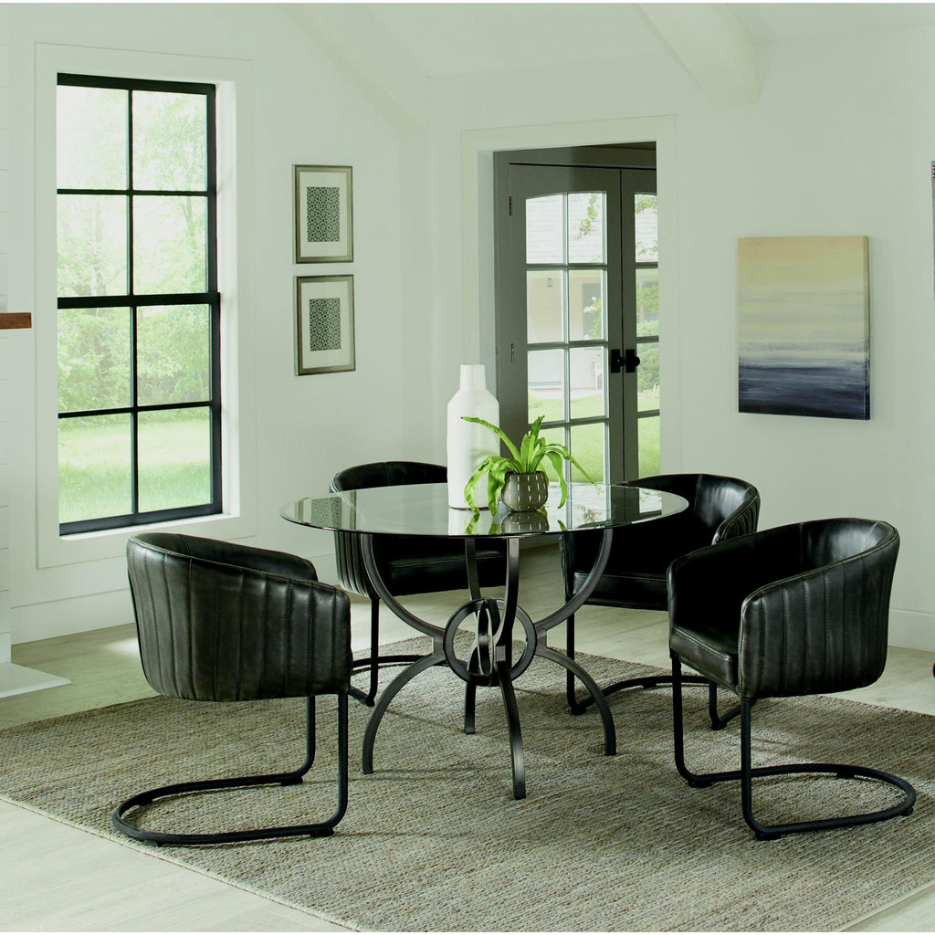 Curves abound on this intriguing transitional glass dining table. Featuring a casual and inviting aura, the table boasts a round of clear glass resting on a bold base. The base shows off metal construction with four stylized M legs that meet in an interlocking ring motif. A gunmetal finish lends a rich final touch. This table is perfect for a stylish breakfast nook or eat-in kitchen.