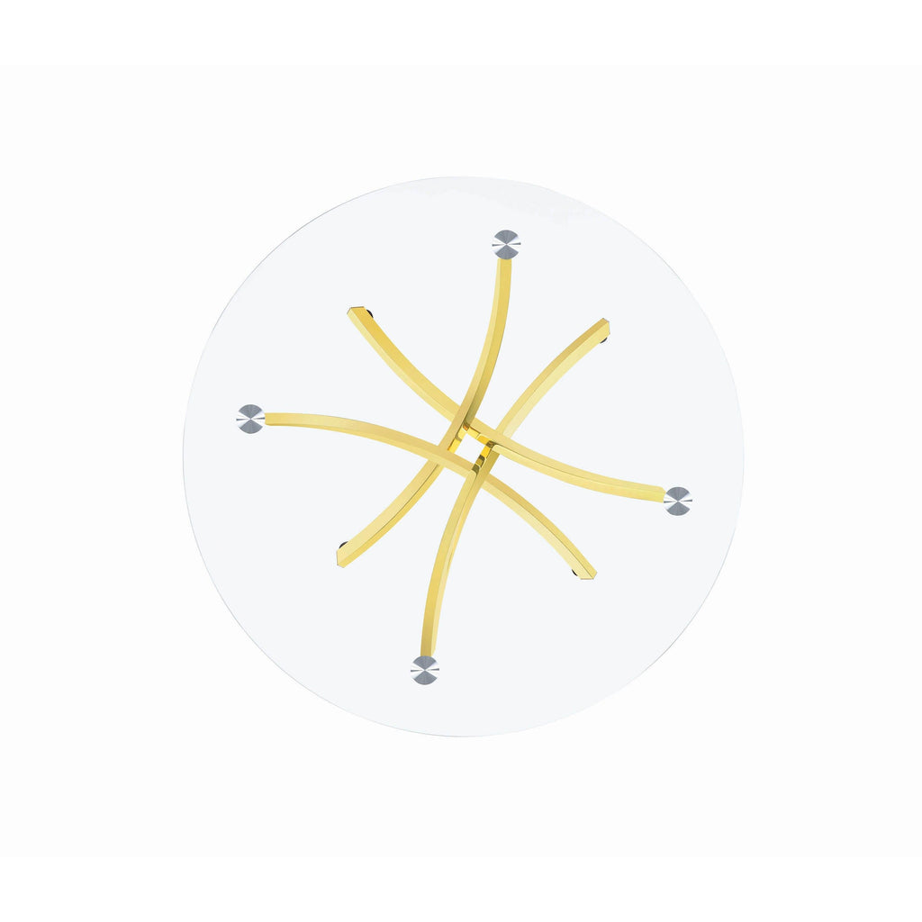 Stay on the edge of contemporary glamour. This dinette table indulges a love of clear glass and embellishes it with a radiant brass finish frame. Artfully designed, its base offers eye-pleasing contoured strips. A round glass top delivers sophistication and elegance. This gorgeous table features floor-protecting discs under each leg.