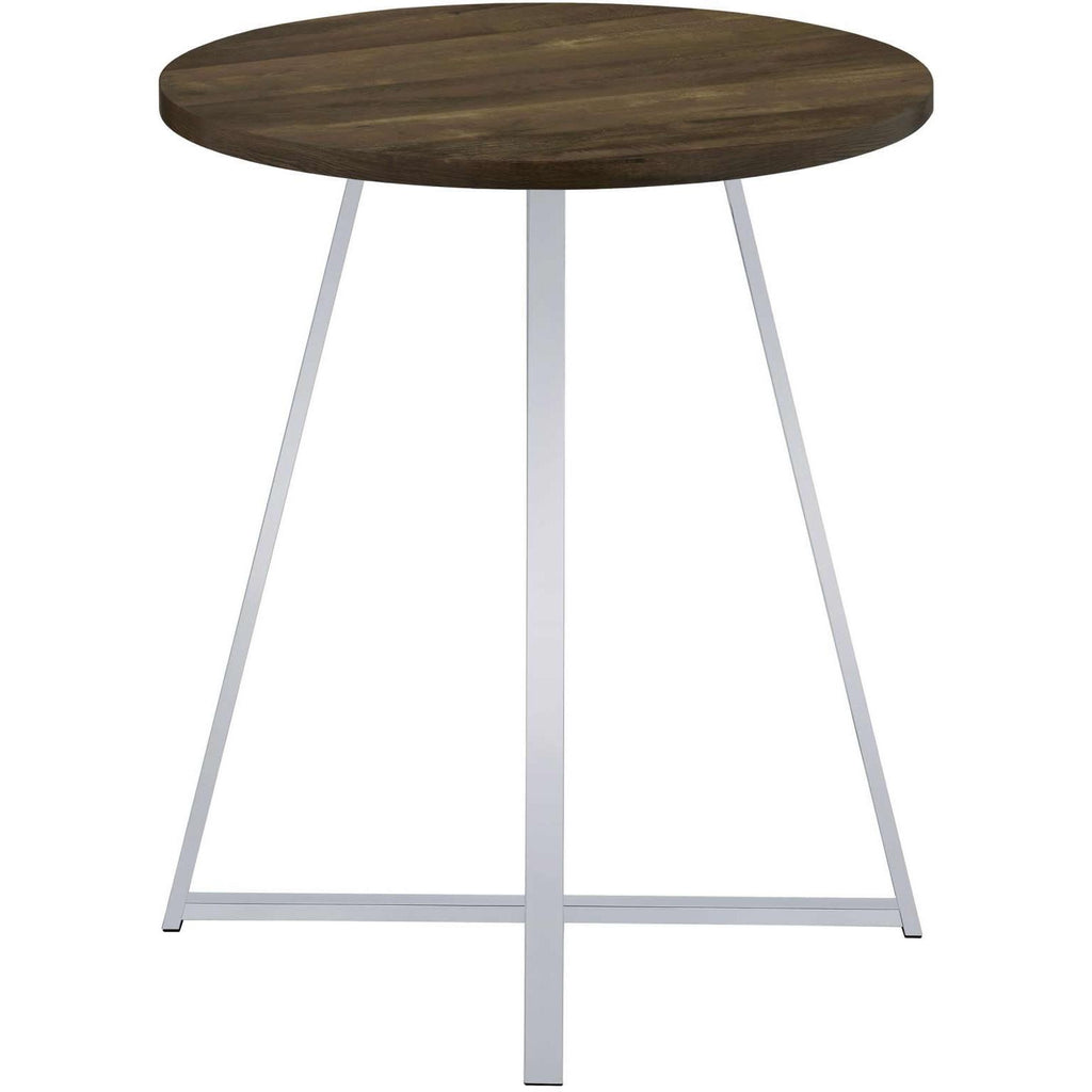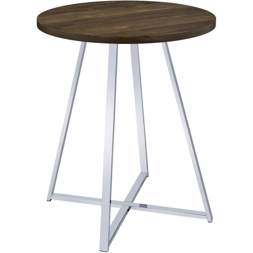 Host your closest friends around this contemporary bar table. Designed with a round, brown oak finished top, this sleek modern bar table invites you stand and converse around or pull up a coordinating rustic-inspired bar stool. Slim metal bars in a bright chrome finish make up the exposed pedestal base silhouette for a metallic accent in your space. Inspired by geometric angles and shapes, the legs join at the bottom, creating an X-shape motif. Place this modern rustic bar table in an entertainment area or home bar for a beautiful statement piece.