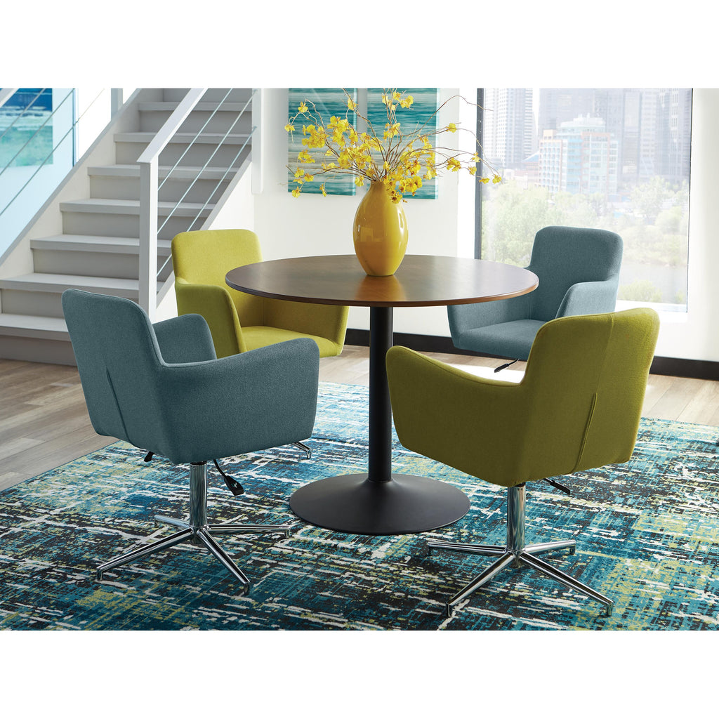 Smooth curves perfectly define the sleek, easy-going silhouette of this round dinette table. Perfectly sized for an eat-in kitchen or breakfast nook, the table features a walnut table top in a rich brown finish. A pedestal base flows into a perfectly round foot that emphasizes its compelling profile. Enjoy everything from a quick bite to a holiday feast at this stylish dining table. Measuring 40-inches across, this round table is built for two to four.