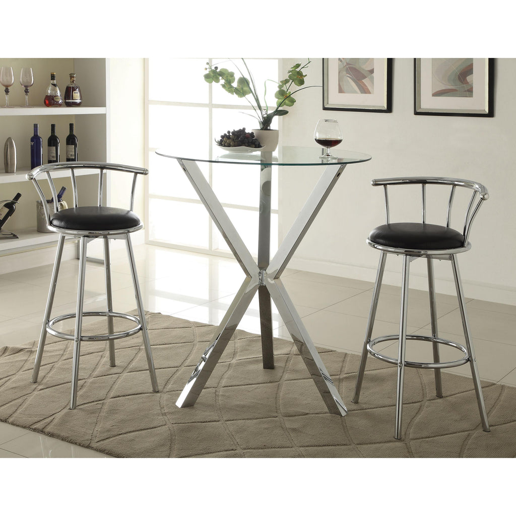 This contemporary bar table adds a touch of simple sophistication to a kitchen or breakfast nook. It features a bold X-shaped base in a shining chrome finish, giving it a sleek, striking appearance. A round glass top completes its elegant look. Modern and stylish, this table is perfect for relaxing with a glass of wine after work or enjoying an intimate meal with someone special. Pair it with matching swivel bar stools for extra comfort and style.