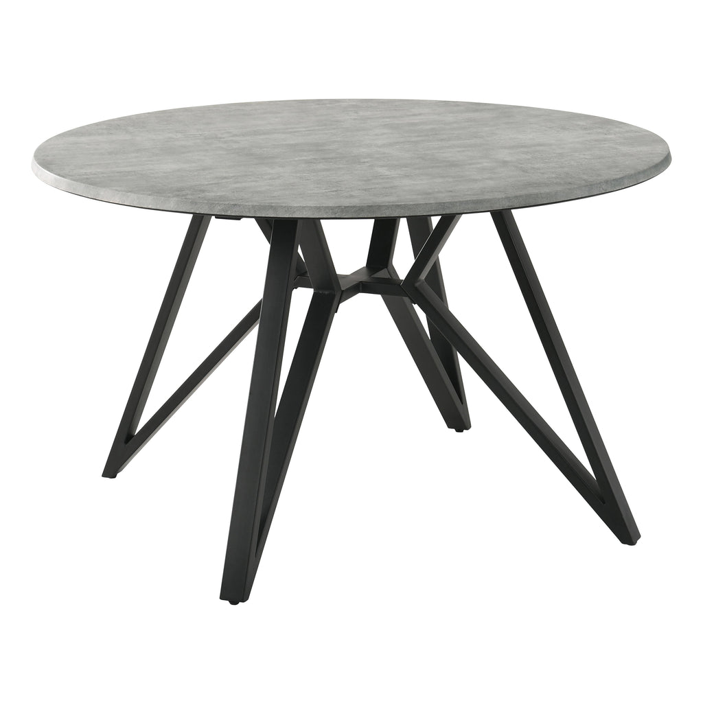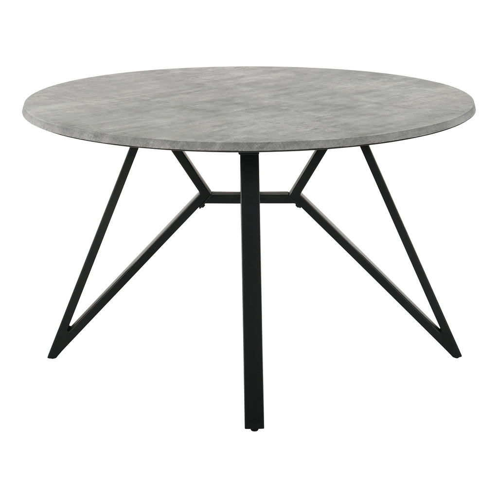 Elevate your modern industrial dining area with this retro-inspired round dining table. Designed with a high pressure laminate table top with a concrete-looking decoration paper, this dining table offers a raw, organic texture to the space. The spacious, round table top rests on a butterfly style iron base, lending a sleek and masculine feel. With a bold, gunmetal finish, it grounds the room and brings a dramatic dark tone. Place this wonderfully designed dining table in a dining room as an eye-catching statement piece.