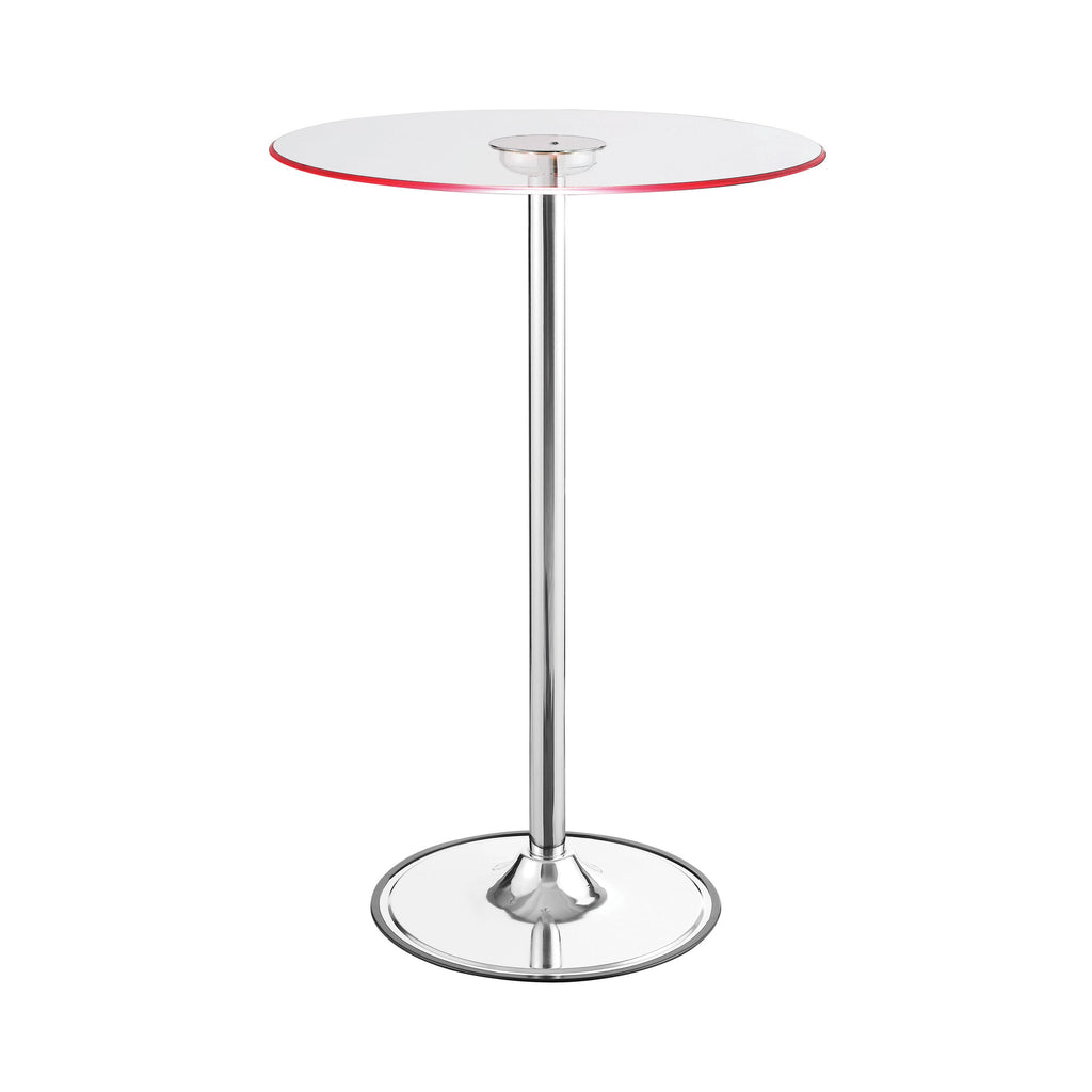 Modern appeal is evident in each and every contour of this contemporary bar table. Its pedestal base boasts a gleaming chrome finish and rounded foot. A petite tempered glass table top is clear, adding to a clean, minimalist presentation. The glass table top is further adorned with transitioning LED lights. Perfect for a compact breakfast nook or a happening home lounge.
