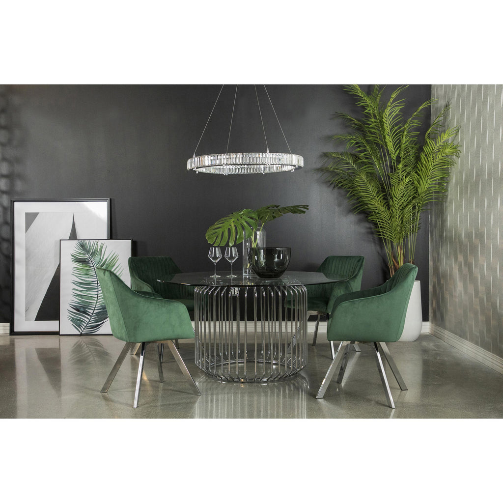With a chic Art Deco vibe and retro-inspired flair, comes this modern dining table. Featuring a cylindrical shape surrounded by slim metal rods all around, this dining table base gives off a cage-like appearance and an open and airy style. With a lustrous polished chrome finish throughout, it opens itself up to existing color palettes, allowing you to play with tablescapes and seating as you wish. Crowned with a 60" round clear tempered glass top, this dining table will surely impress.