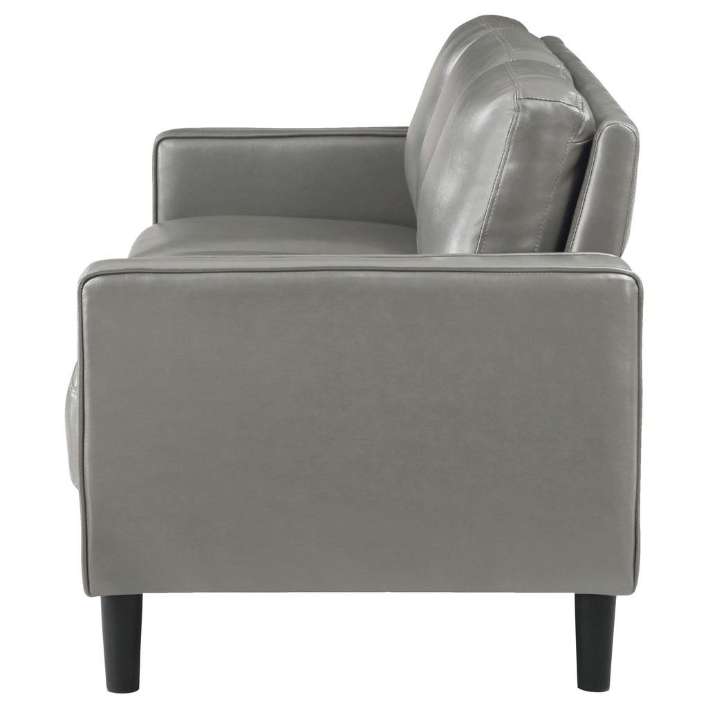 Establish the foundation of a stylish living room with a modern sofa. Smooth faux leather creates a sleek, neutral look that brims with sophistication. Track arms create a structured silhouette, offering tailored flair with an understated ambiance. Straight, tapered legs support the sofa and ensure stability. Supportive cushions create an inviting look and feel, with sinuous spring decking under seat cushions and webbing across the back for optimal comfort.