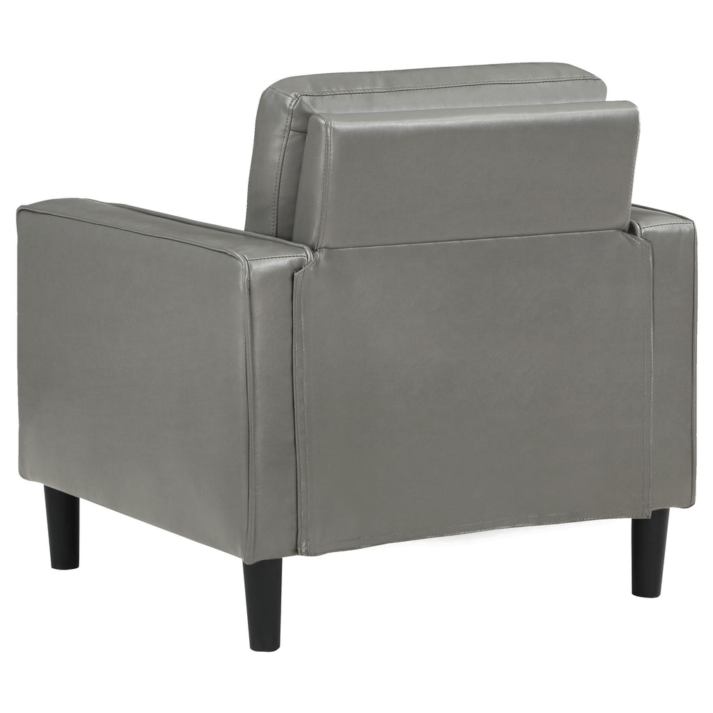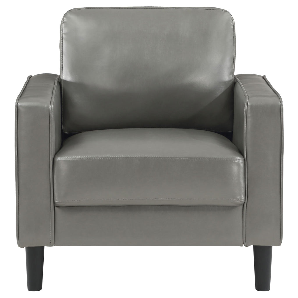 From your stylish home to a professional setting, this modern armchair is a chic choice. It features a structured silhouette with a compact footprint and straight track arms. Faux leather upholstery is smooth and sleek, offering a refined touch that can be styled for sophistication or relaxation. Sinuous spring decking supports an attached seat cushion, providing excellent support and comfort. The back includes webbing, with a structured profile defined with square track arms.