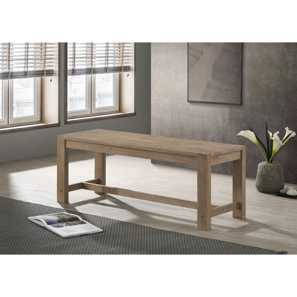 Introduce casual character with a modern farmhouse dining bench. The backless design features a trestle base detail and wooden seat, creating a simple, inviting look. It's crafted from Asian hardwood and features a washed brown finish. Wire brushing adds texture and depth. Square post legs provide excellent support.