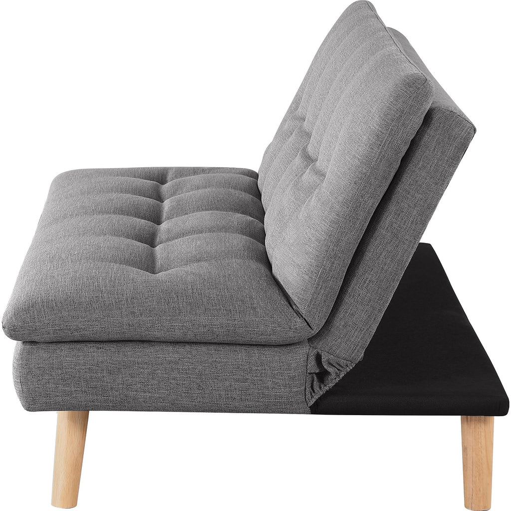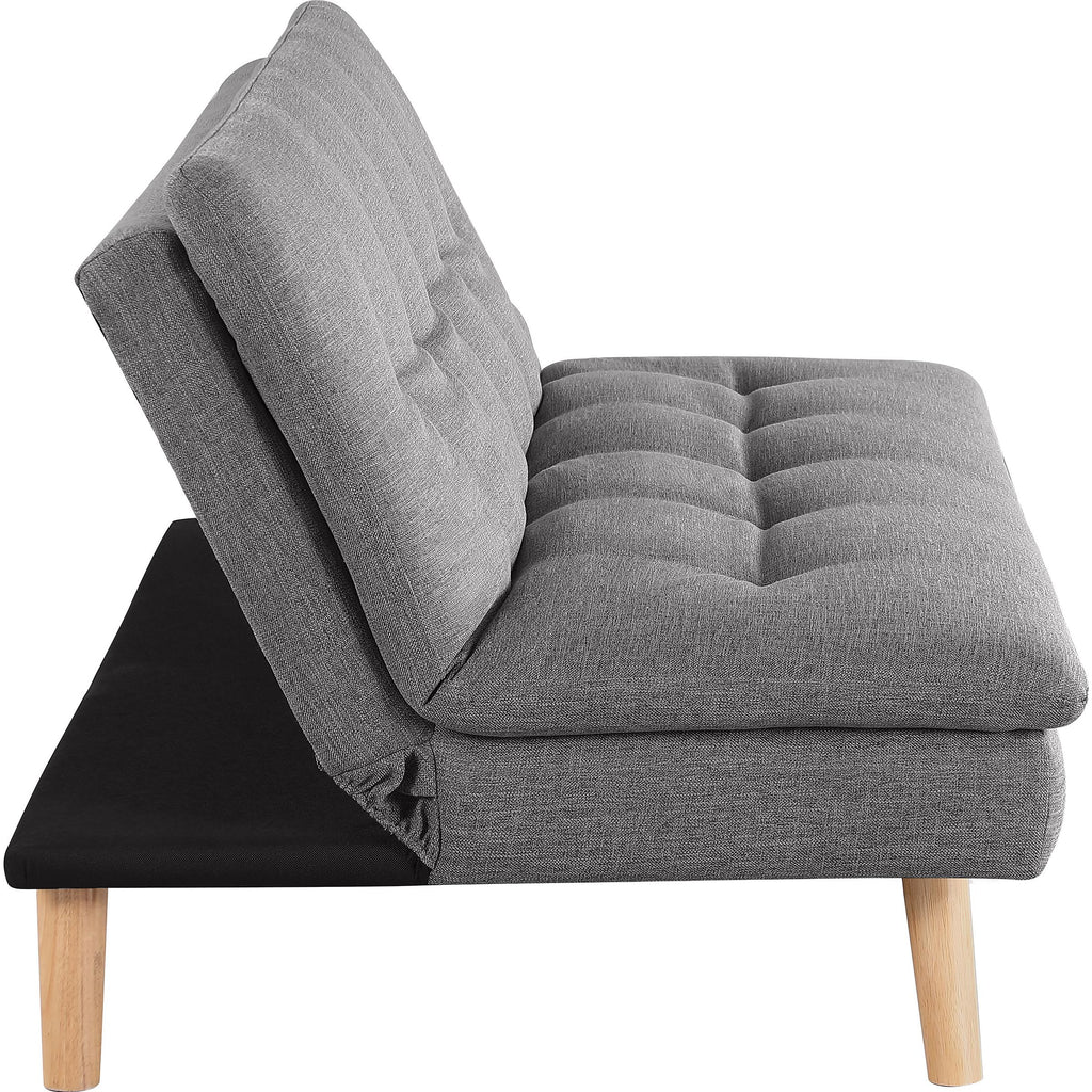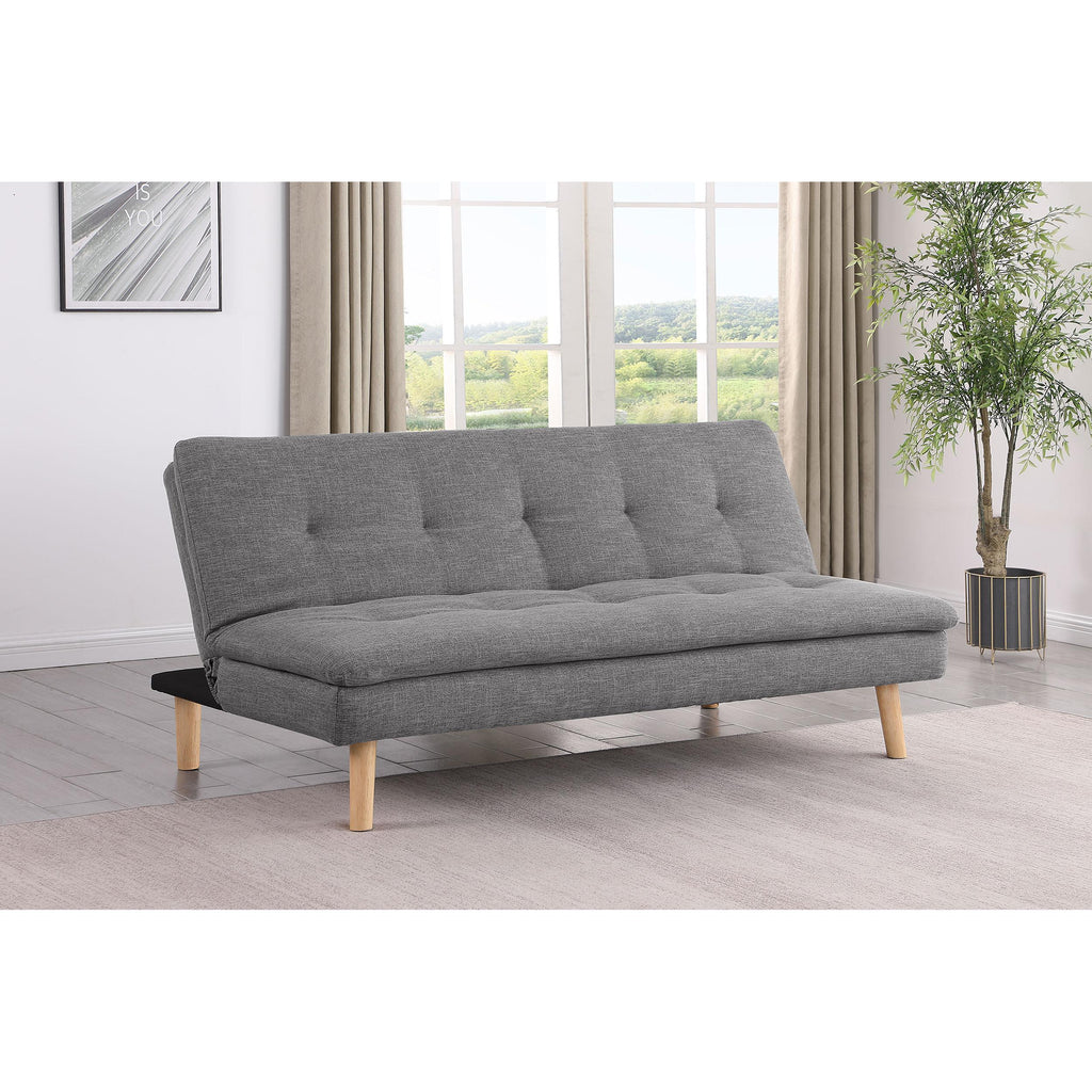 Create maximum flexibility in your space with a modern sofa that folds flat to create a bed when guests spend the night. The sofa is a minimalist design complete with an armless silhouette. It's upholstered in a medium gray, offering chic style in a den or home office. Its foam cushions is gently tufted to add depth and texture. The sofa rests on tapered, splayed legs with a natural wood finish, adding a light, airy final touch.