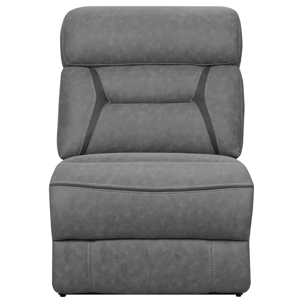 The Higgins Power Reclining Sectional offers a contemporary design, comfortable seating and wall hugger reclining mechanism. It comes upholstered in grey faux leather fabric and is beautifully adorned with contrasting color accents, welt trim, and stitching details. The Armless Chair features a sectioned back with defined headrest and a pad-over-chaise with padded footrest.