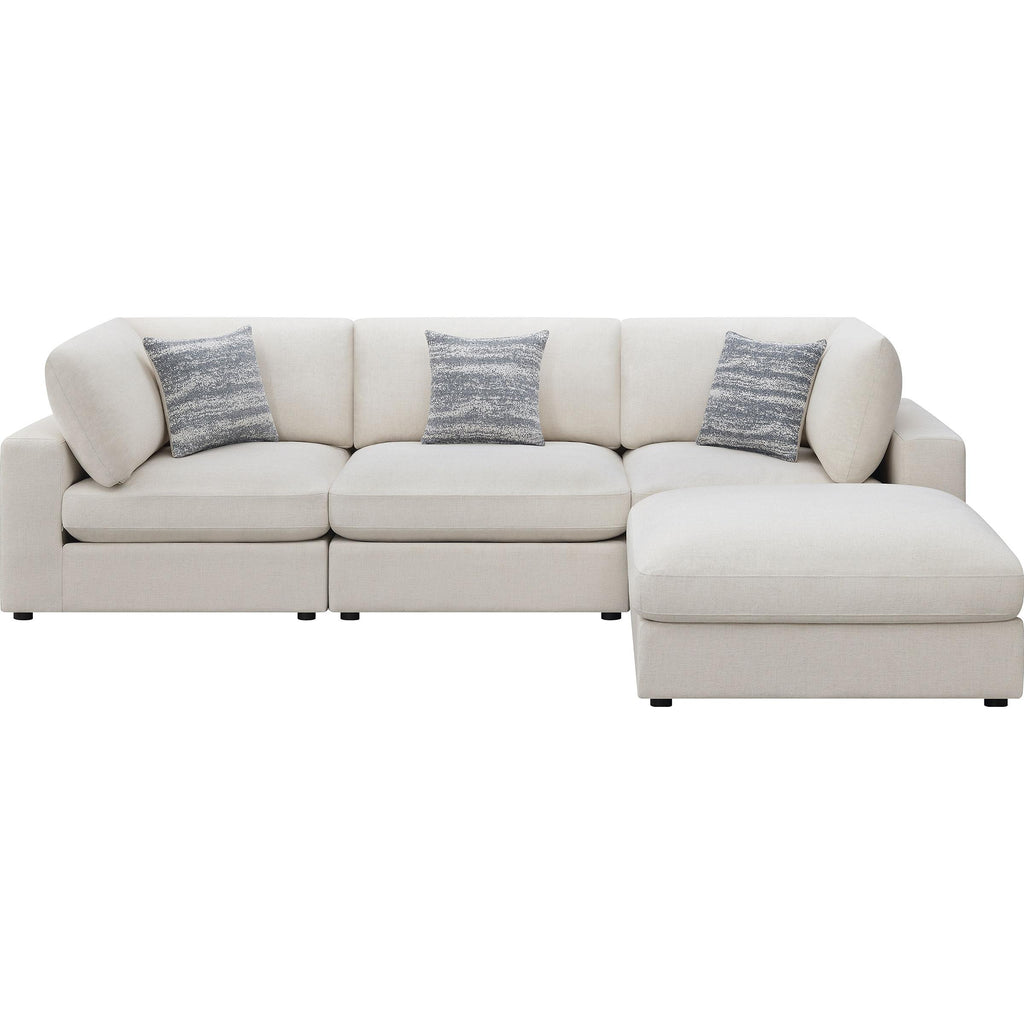 Create a welcoming seating area with this four-piece contemporary sectional. Designed with one armless chair, two corner chairs and one oversized ottoman, this modular sofa lends itself wonderfully to casual, chic entertainment spaces and family living rooms. Wrapped in a breathable linen-like fabric that is soft to the touch, this stylish sectional also features a neutral hue than offers a serene look to a restful retreat. jacquard accent pillows offer extra texture and dimension against the reversible back pillows. Slide the ottoman against a seat to transform the side into a chaise lounge to stretch out or rotate it in front to act as a coffee table for a drink tray.