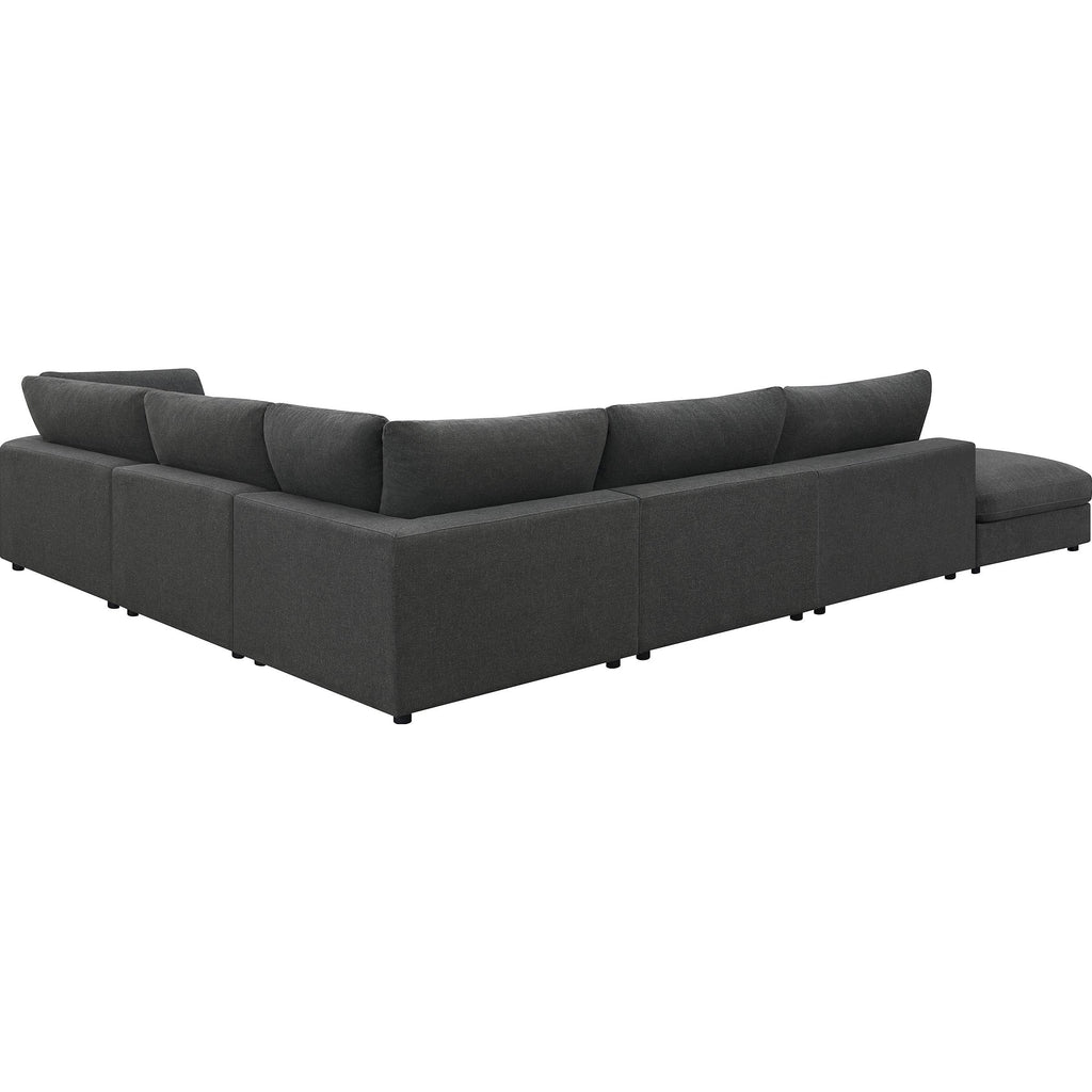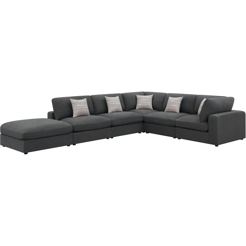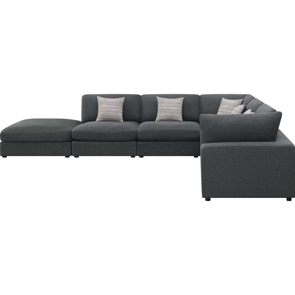 Covered in a linen-like fabric all around, this super comfy six-piece sectional offers all the seating you need in an open concept living room or entertainment area. Designed with three armless chairs, two corner chairs and a single oversized ottoman, this contemporary modular sectional offers reversible pillows and jacquard accent pillows that you can really sink into. Black feet peer from beneath, offering a slight elevation for rugs and other flooring. With an L-shape design, this sectional works in a variety of room dimensions. A spacious ottoman also doubles as a coffee table, keeping a tray of refreshments and snacks when hosting guests.