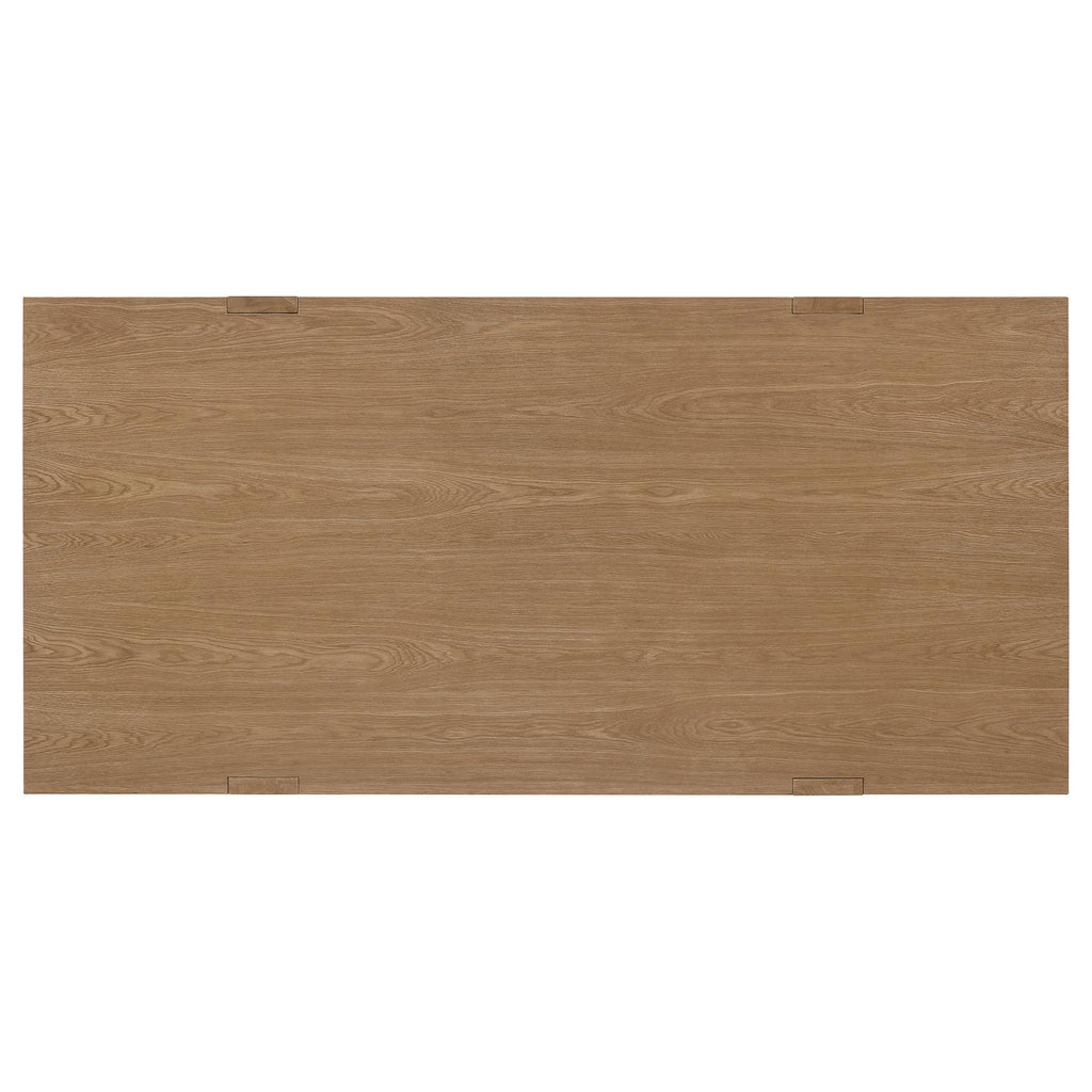 Elevate your dining room with the captivating blend of modern farmhouse style in this stunning dining table. The brown wire-brushed finish highlights the natural beauty of the wood, adding warmth and character. The open, airy U-shaped legs and wide trestle base infuse a distinct modern touch to the classic farmhouse look, creating a unique and eye-catching design.