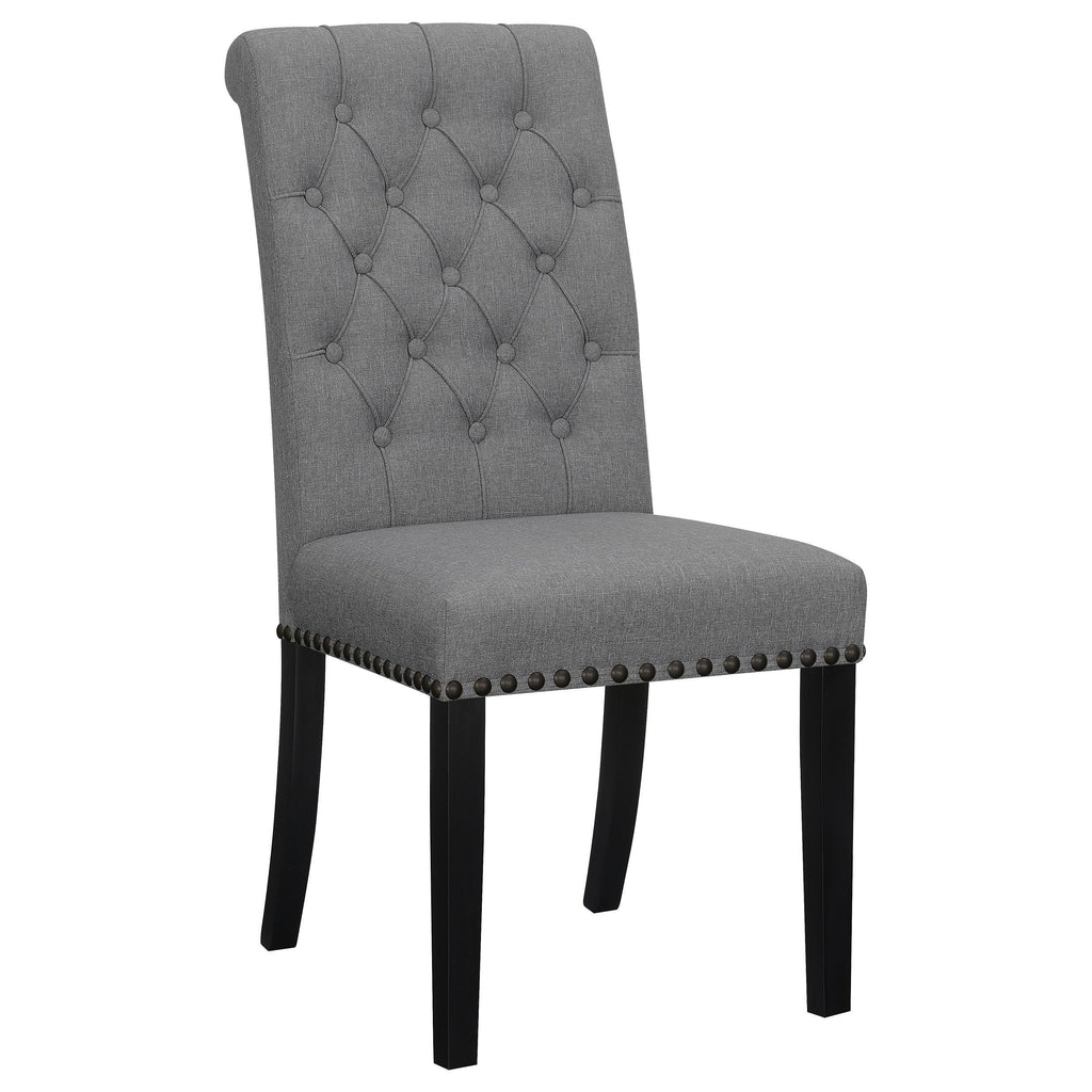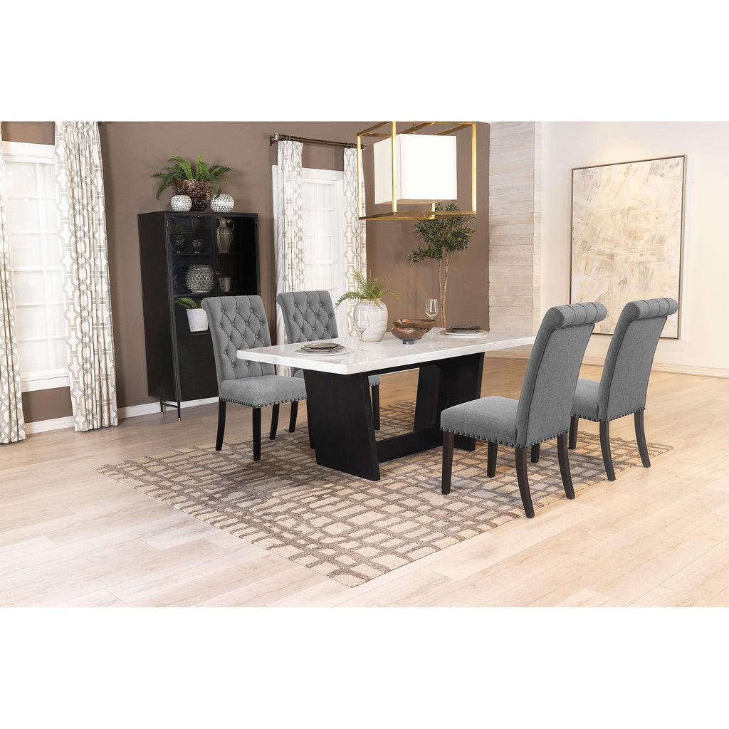 Bring together family and friends at this modern rustic style dining table set. The table features a rectangular, thick, white marble top that is spacious enough for six people. Sleek open and airy trestle base with a center punch out, rustic espresso striking color combination lends a dramatic touch and grounds the room elegantly. The set of chairs with a rolled backrest with button-tufted details lends a traditional aesthetic to a space. Also, bringing to your home the classic elements is a padded seat with individual nailhead trim that offers a charming detail.
