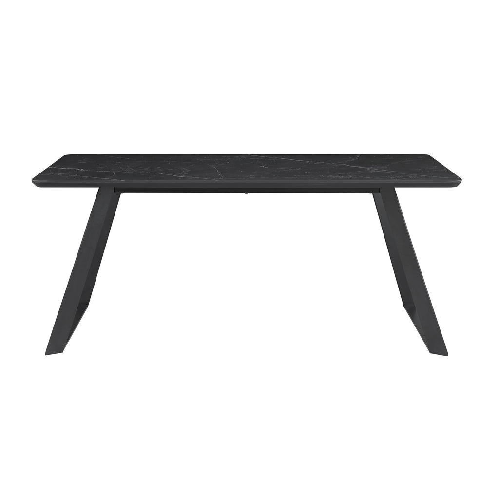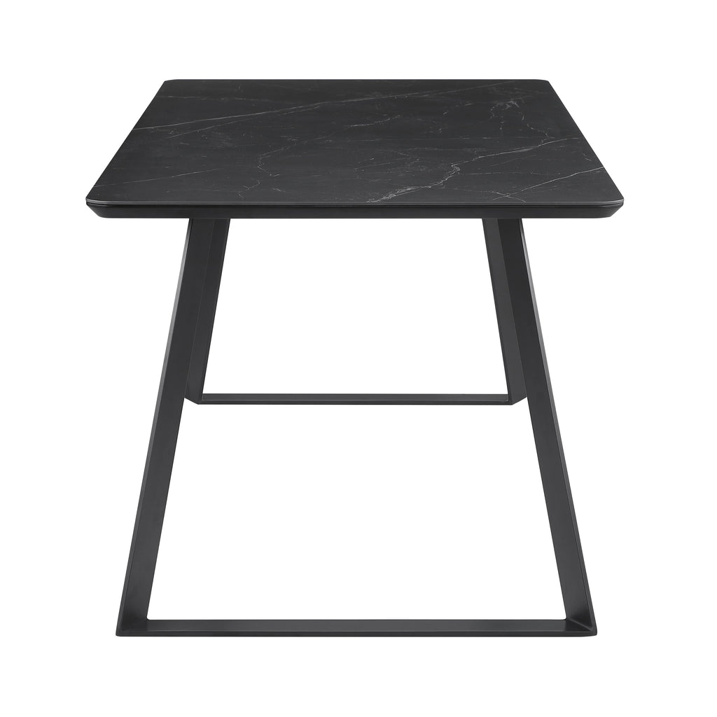 Transform your dining room into a sleek interior with this modern dining table. A bold, matte gunmetal finish defines the hard edges and clean lines of this stellar mid-century modern-inspired dining table. A spacious rectangular top with a rounded bevel edge presents ample seating for six guests. Sled style legs flare outward, creating a dramatic expression. A black China ceramic tabletop with softly rounded corners features an elegant white striation throughout for a classically designed marble-like appearance.