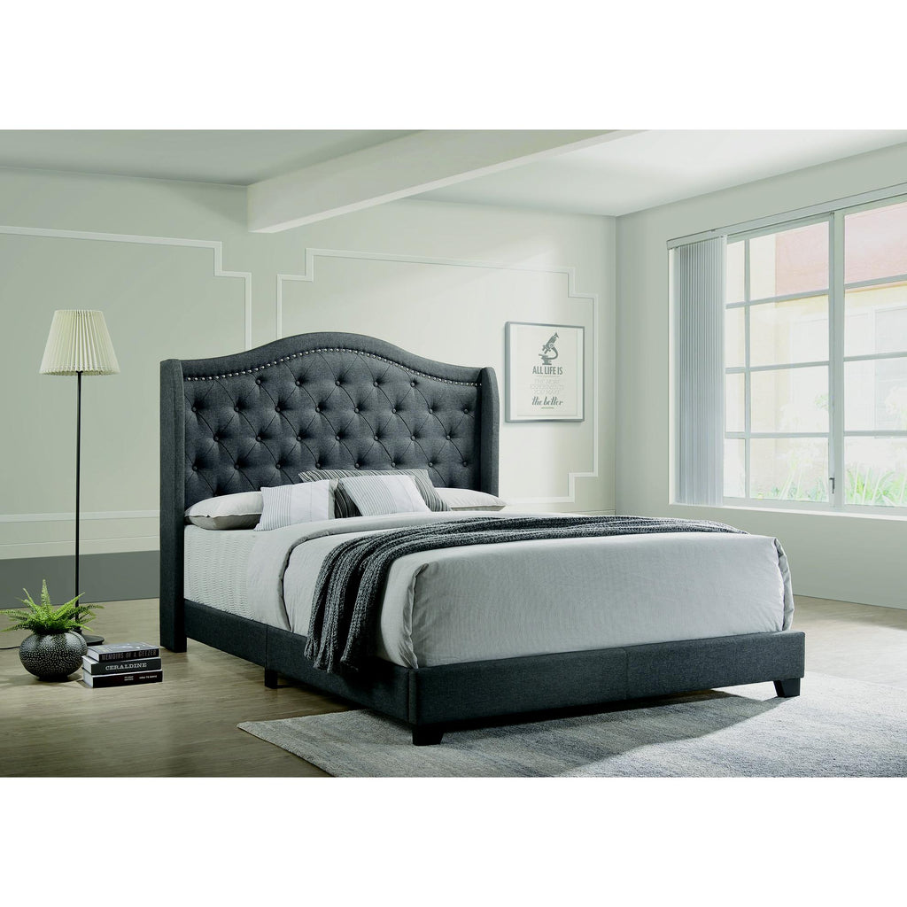 A tall and imposing headboard ups the drama factor for this Sonoma upholstered bed. Beautiful linen-like fabric wraps the headboard, rails, and low-profile foot rail to create a composed look. The headboard features a camelback profile that softens its silhouette. Button tufting is presented in multiple horizontal rows, adding texture and depth. Nailhead trim is a wonderful, classic finishing touch.