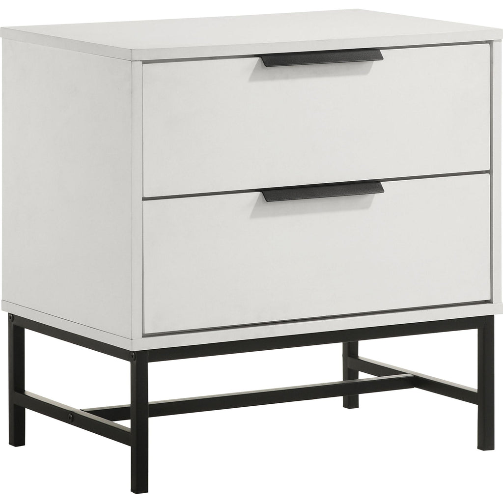 Reimagine your bedroom retreat with the crisp, clean appeal of a modern four-piece bedroom set. Its clean, precise style is emphasized with sleek silhouettes and a bright white finish. The set centers on a chic bed with a tall headboard and low footboard, offering fresh style with geometric tufting in dark gray padded upholstery. Black finish legs complete the bed and bring cohesive style to the set, matching bases and hardware on the dresser and nightstand. The dresser offers plenty of storage and includes a framed mirror on top, adding bright reflectivity to your bedroom ensemble.