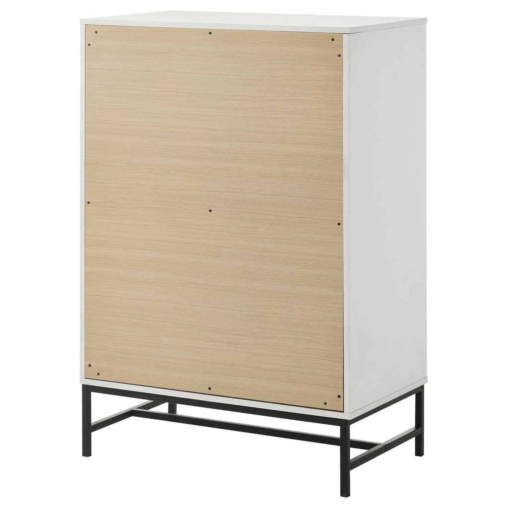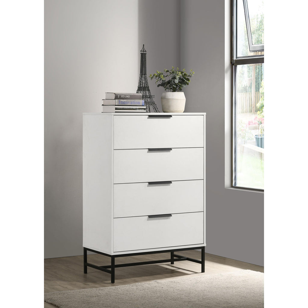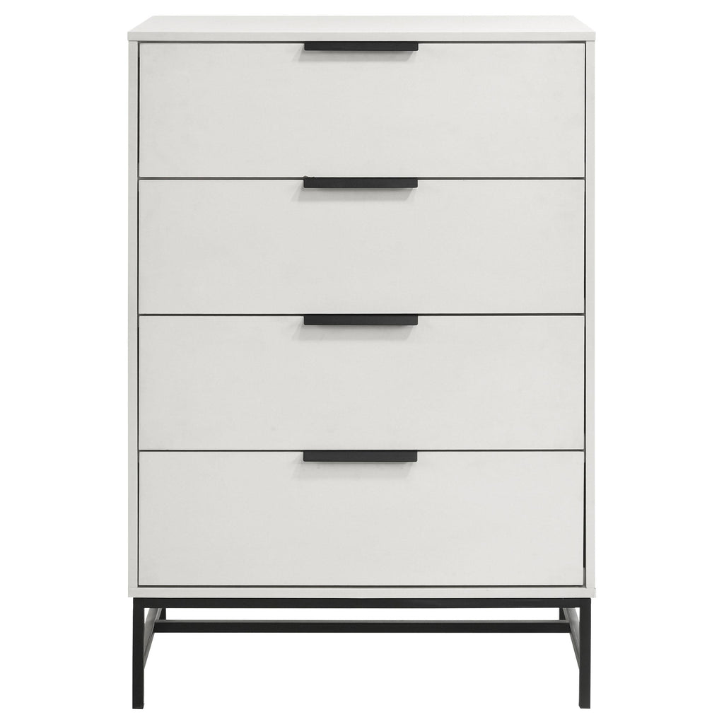 Create ample storage with the compact footprint of a modern four-drawer chest. Its roomy drawers are ideal for clothing, linens, and accessories, helping to keep your personal space tidy and organized. A white finish complements straight, clean lines, while black hardware adds contrast and depth. complementary metal base in black adds light, airy ambiance. Use the top for decor like photos, or add a jewelry box for a personal touch.
