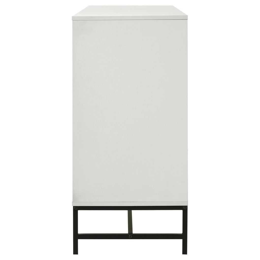 Fresh white brings bright, contemporary appeal to a modern six-drawer dresser. Perfect for a refined or casual bedroom space, it features a melamine finish that's durable and resistant to damage, great everywhere from master suite to a kid's bedroom. Each drawer features a long black finish bar pull that adds contrast. A matching black metal base elevates the dresser and creates an airy finishing touch. Use the top for decor that adds a personal touch to your bedroom.