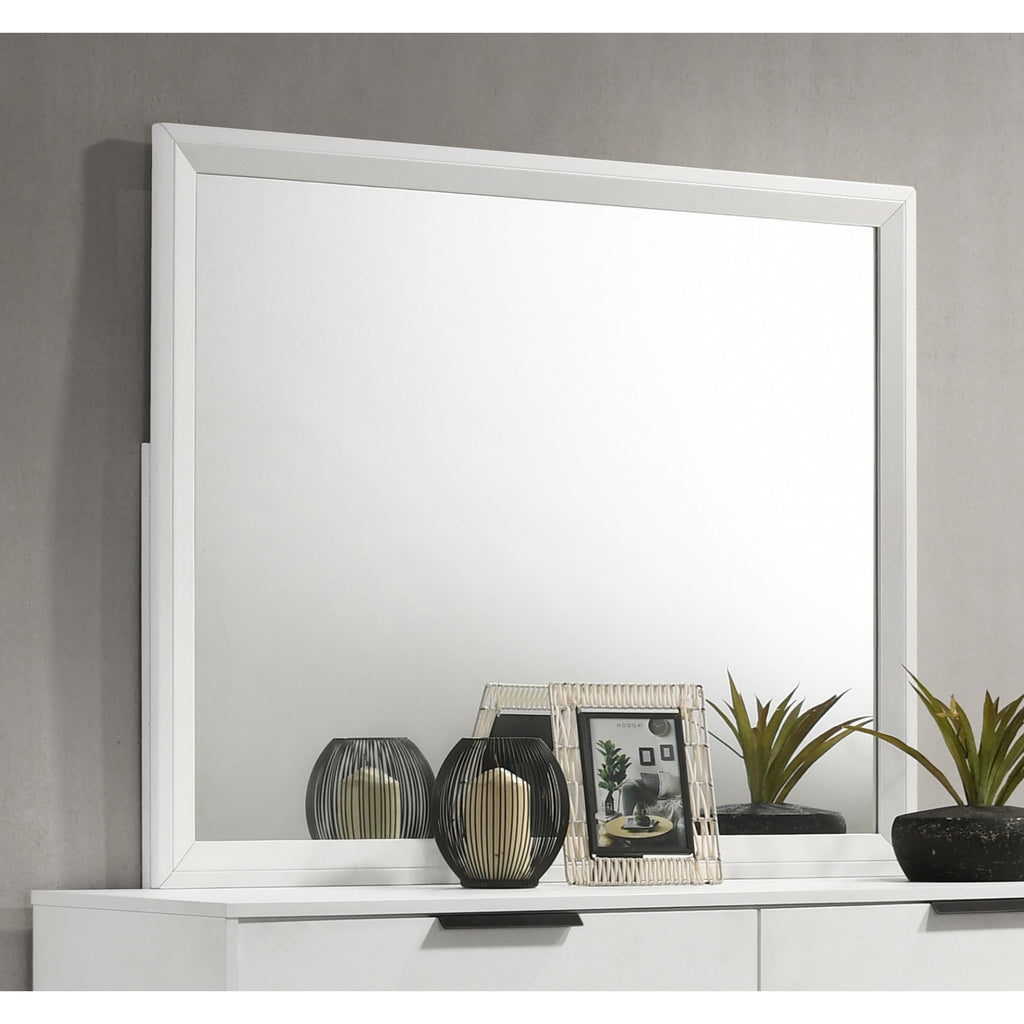 Upgrade your bedroom with the stylish look of a modern dresser mirror. This design is framed, with smooth trim and open corners. A white finish is fresh and contemporary, offering versatility to complement a variety of dressers. The mirror mounts to the back of your dresser, updating new or existing furniture in your inviting bedroom space. The mirror glass is flat, offering a contemporary look and feel.