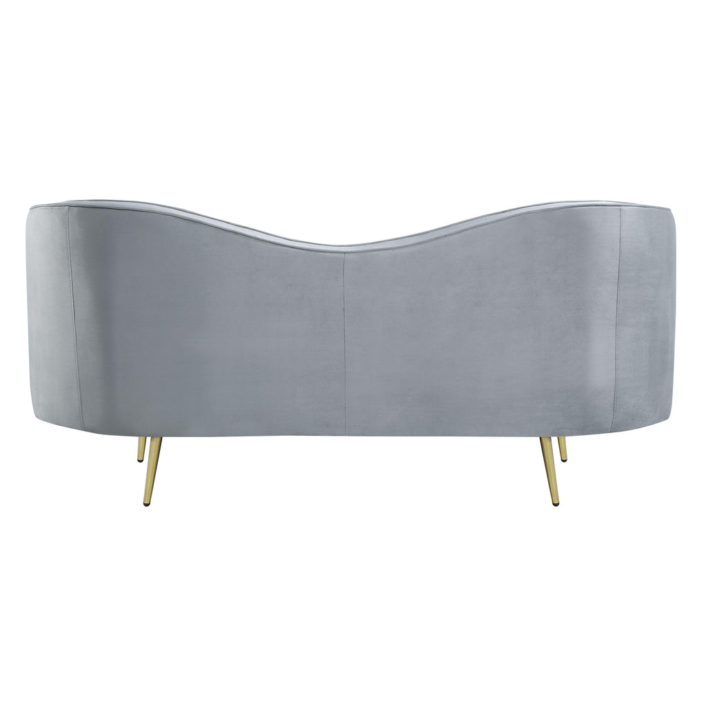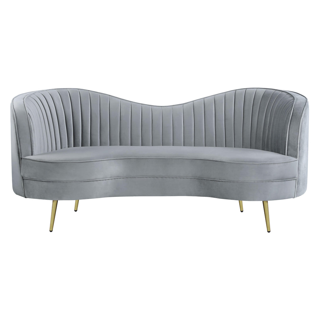 Transform a conventional space into a parlor-inspired retro room with this chic sculptural loveseat. Alluring curves infuse romance into a kidney-shaped loveseat created to become a focal point. This loveseat is fully encased in solid wood and covered in soft, supple gray velvet. Dimensionality and texturizing result from smart vertical channeling on its back interior. Gold finish stainless steel tapered legs round out a list of charming attributes, contributing to an ensemble or becoming a solo seating piece in a compact room.