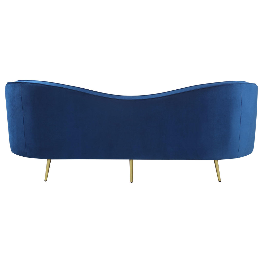 With an Art Deco flair, this retro-inspired sofa offers a striking curvy silhouette with a bold colored fabric. Wrapped entirely in a bright blue velvet that is super-soft to the touch, this contemporary sofa presents itself as the focal piece in your seating area. With a channel tufted interior cushions and kidney-shaped bench cushion, this tuxedo-inspired sofa offers a twist on a timeless iconic style. An inverted camelback silhouette with gleaming gold tapered legs lend a mid-century flair. Complete your seating ensemble with an available matching loveseat and barrel-shape chair.