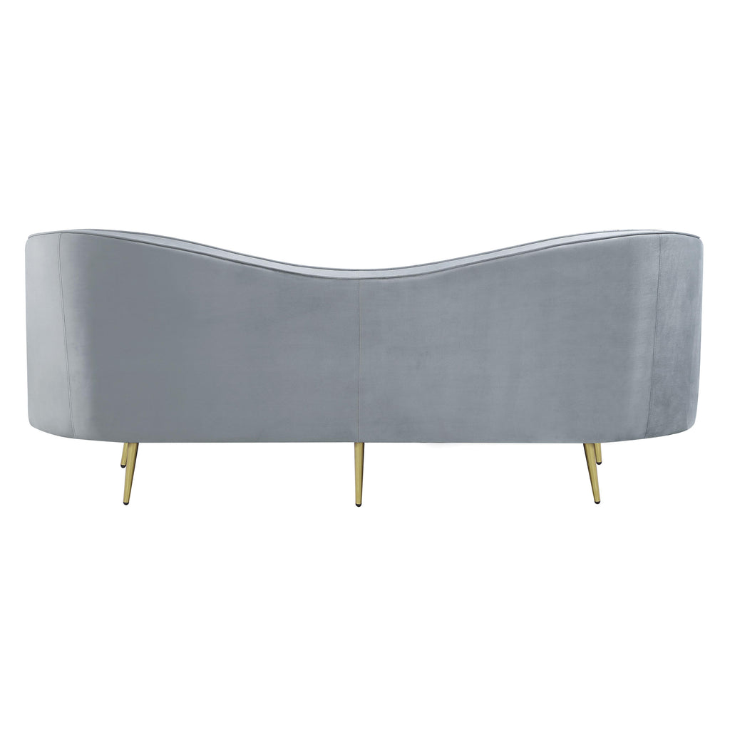 Adding a chic, mid-century inspired vibe, this elegant sofa delivers the magic of a fashionable interior design period while lending a sophisticated anchor piece to an upscale living space. Embrace the iconic kidney silhouette known for its era, making the most of alluring curves. This sofa is fully encased in solid wood and covered in soft, supple gray velvet. Dressed up with tailored, vertical channels on its interior back, dimensionality becomes a key feature. Gold finish stainless steel tapered legs round out the list of charming attributes, making this a go-to piece for a stylish modern or transitional space.